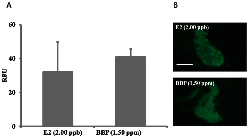 Estrogenic activity of phthalate BBP. (A): BBP (1.50 ppm) induced GFP signal intensity (RFU) compared to that of E2 (2.00 ppb), data are mean ± standard error of the mean; (B): Representative photos of the livers of transgenic medaka (O. melastigma) eleutheroembryos after 24-h exposure to E2 (2.00 ppb) and BBP (1.50 ppm). Scale bar equals to 100 µm.