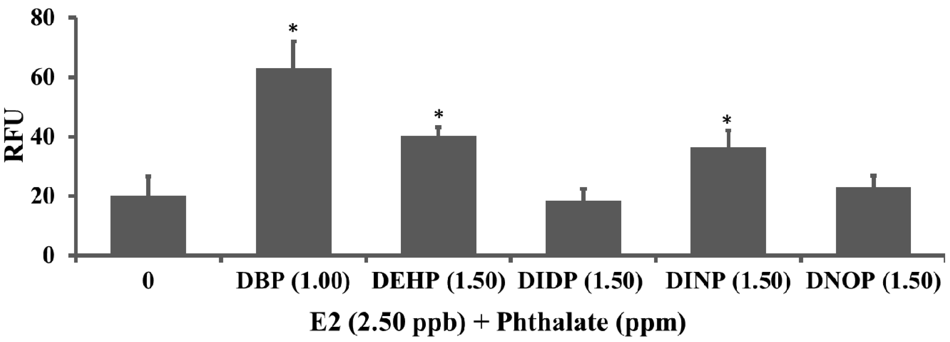 Results showed that 1.00 ppm DBP, 1.50 ppm DEHP or DINP significantly increased the green fluorescence intensity (RFU) induced by E2, indicating the enhanced-estrogenic activity of the three phthalates (Figure 5). DIDP and DNOP did not significantly affect (increase or decrease) the GFP signal intensity (RFU) induced by E2 (Figure 5), meaning these two phthalates are not estrogenic endocrine disrupting compounds.