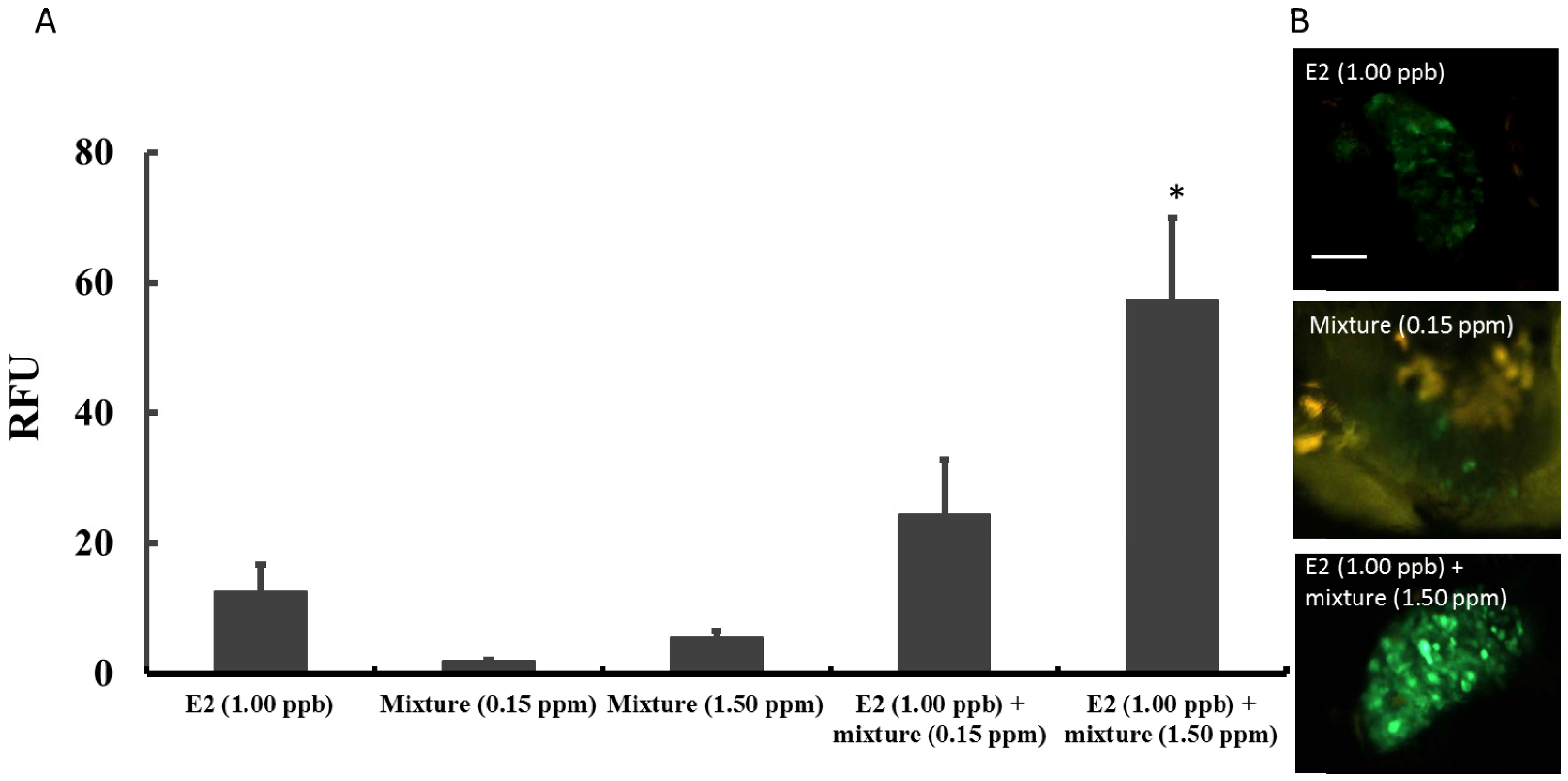 Further tests were performed to find out whether mixtures of the six phthalates have estrogenic or enhanced-/anti-estrogenic activity. Phthalates were mixed at the stated concentrations and tested. Figure 6A shows that phthalate mixtures at 0.15 and 1.50 ppm induced very week GFP signals (RFU), demonstrating the weak estrogenic activity of the phthalate mixtures. However, when co-exposed with E2 (1 ppb), phthalate mixture at 1.50 ppm mixture, but not 0.15 ppm, significantly increased the transgenic O. melastigma eleutheroembryos’ liver GFP signal intensity (RFU). Representative photos of the livers of transgenic eleutheroembryos after 24 h exposure to E2 (1.00 ppb), phthalate mixture (0.15 ppm) and E2 (1.00 ppb) + phthalate mixture (1.50 ppm) respectively, are also presented (Figure 6B).