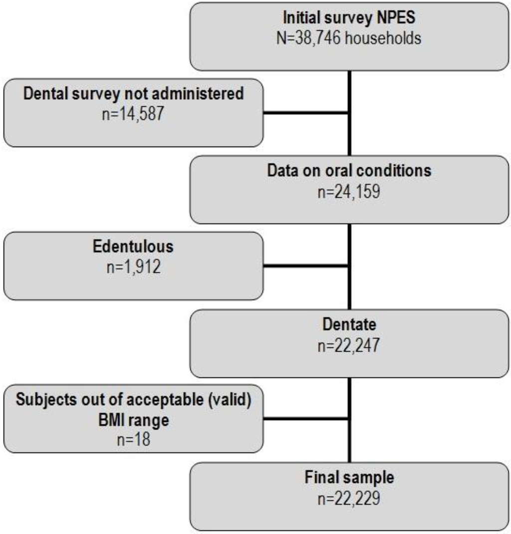 The present study conducted analyses of the National Performance Evaluation Survey 2003 (NPES) in Mexico. This cross-sectional study was part of the technical collaboration between the Ministry of Health and the World Health Organization (WHO), which used the survey instrument and sampling strategies developed by WHO for the World Health Survey (WHS). Further details of the survey methodology and on some oral health indicators are available elsewhere [33,34,35,36]. Information was collected from 38,746 households, with a mean of 1,250 households for each State. The sample design was probabilistic, multistage, stratified, through conglomerates, and was calculated to provide representative information at the State level, and across urban and rural areas. Data on dental conditions are available for only 20 out of the 32 States of Mexico (not every state implemented the entire set of survey modules), leading to a total of 24,159 households. Only subjects with teeth were included in the present analysis, so the final sample comprised 22,229 participants (Figure 1).