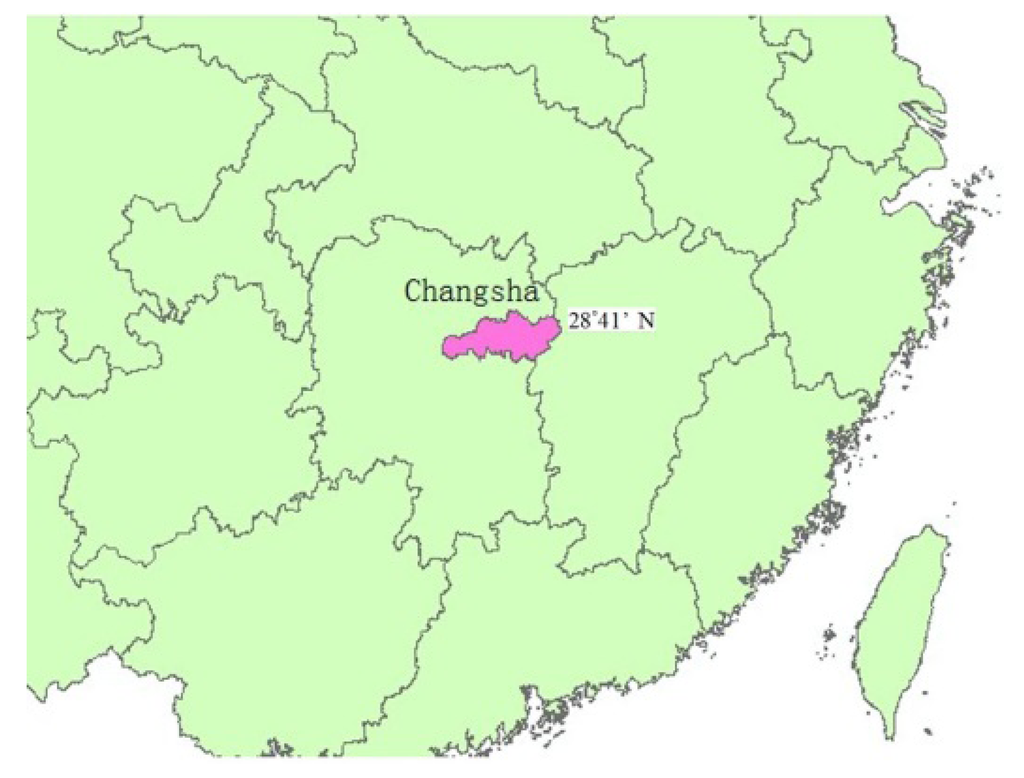 Our research area was Changsha City (27°51′–28°41′ North, 111°52′–114°15′ East), the capital of Hunan Province located in the middle reaches of the Yangtze River basin (Figure 1). According to the 2011 census, Changsha covers 11,816.0 km2 and has a population of 6.57 million [23]. This area has a typical subtropical climate with high temperatures in the summer (Jun–Aug) and cold temperatures in the winter (December–February).