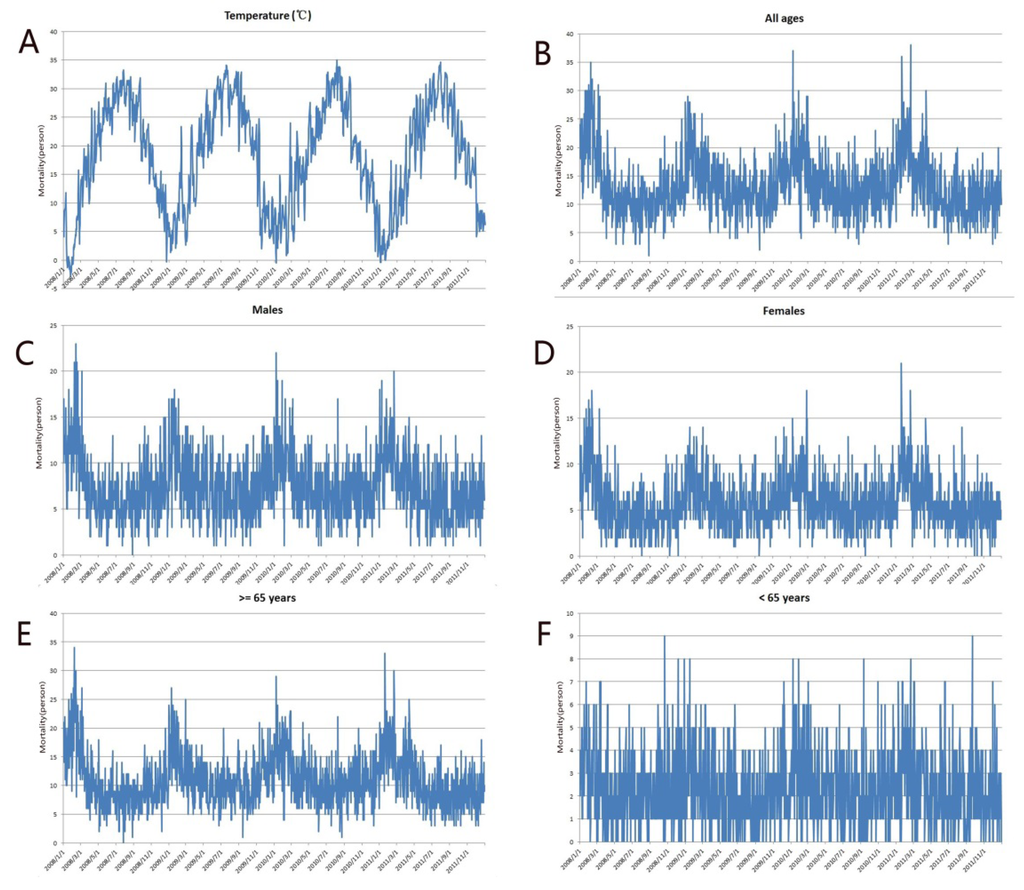 Time series of daily mean temperature (A), and time series of CVD mortality for (B) all ages, (C) males, (D) females, (E) those ≥65 years, (F) those <65 years, all of the vertical axis in these subfigures denote death count.