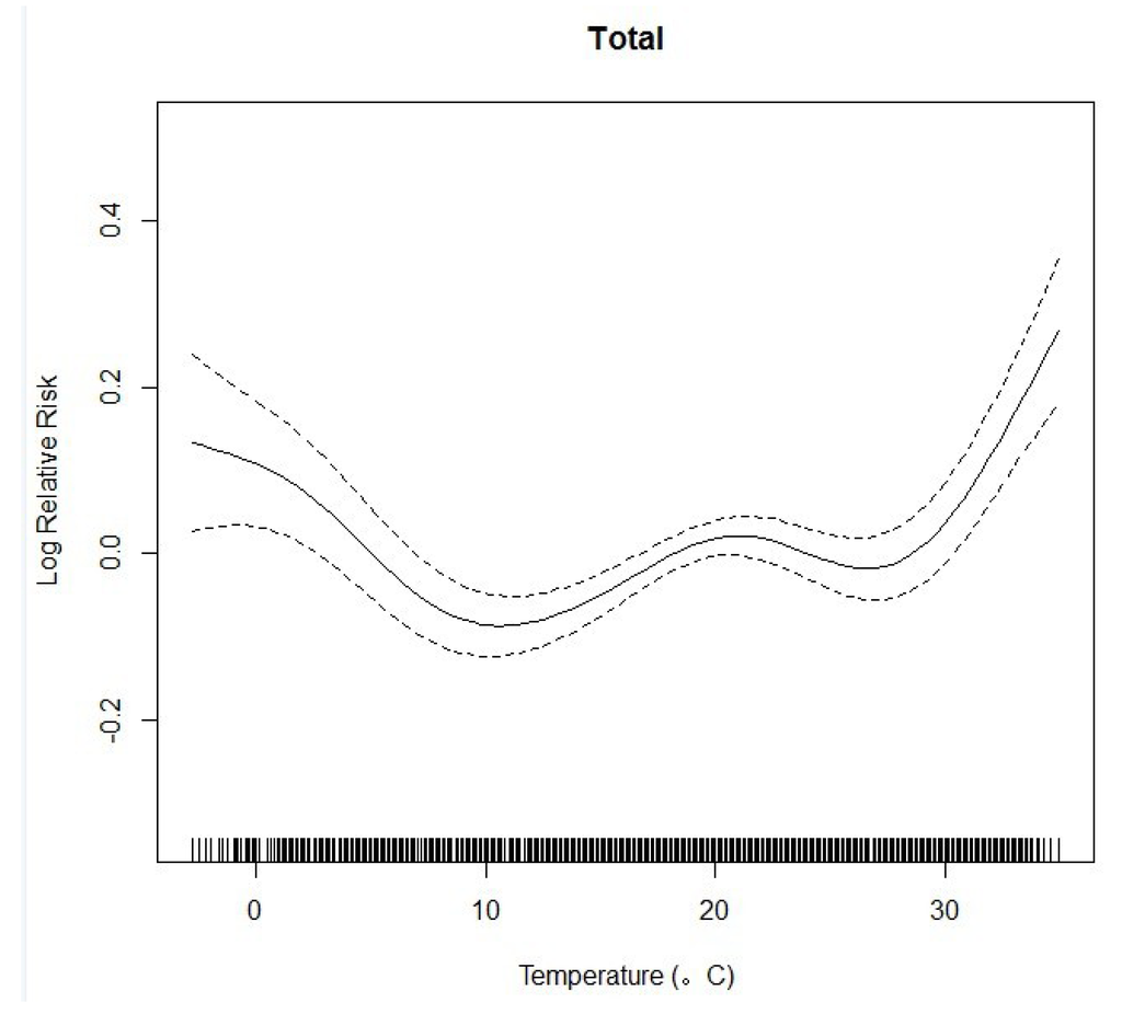 We plotted the relationship curve between the log relative risk and the mean temperature of the current day for all ages. This resulted in an U-shaped association curve (Figure 3).