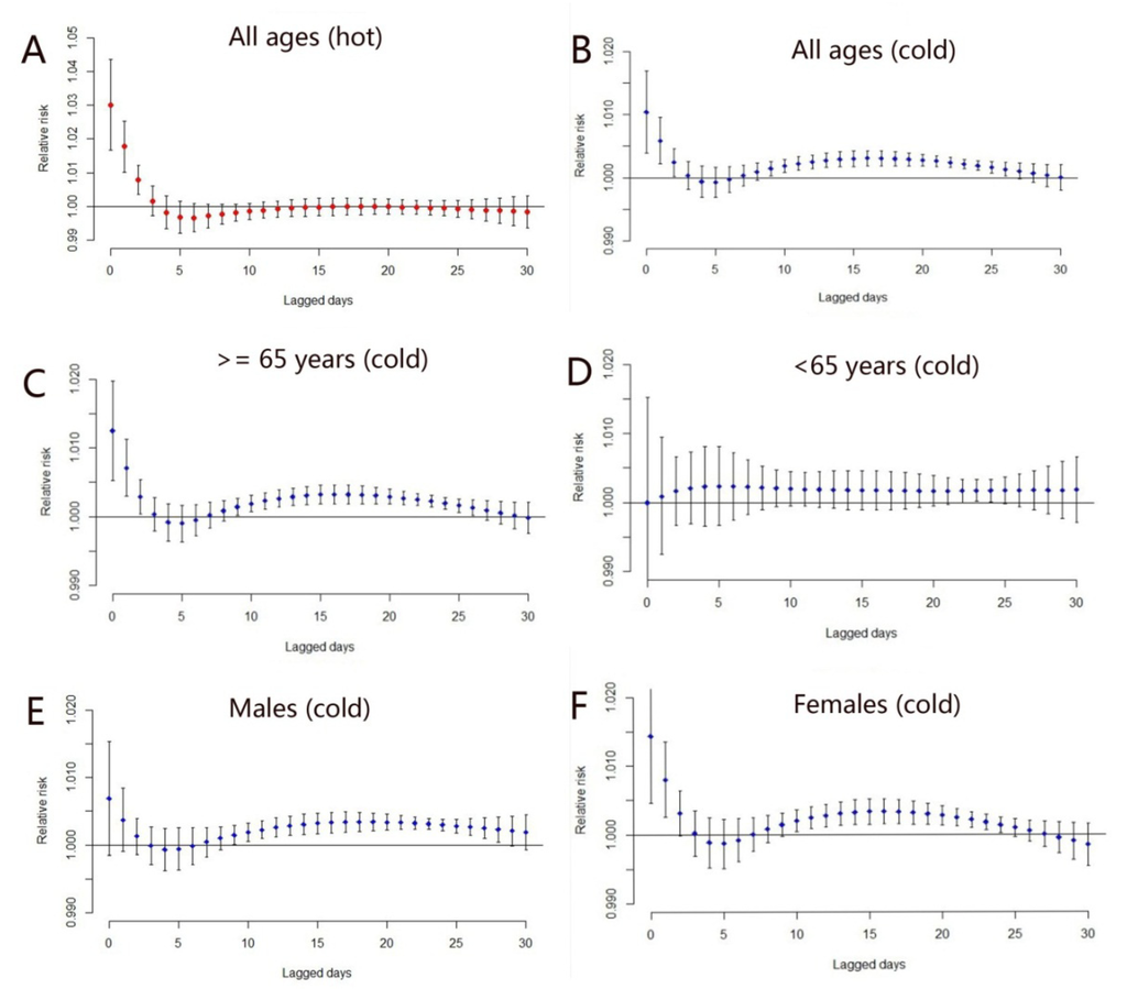 The lag period of cold-related mortality varied between the different groups (Figure 4B–F). Cold temperatures in the previous two days affected all ages, those ≥65 years, and females. However, they did not increase the death risk of those <65 years and of males. Cold temperature in the previous 10–25 days affected all groups except those <65 years.