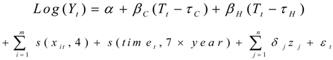 We used the GAM, as follows, to detect the temperature thresholds [17,33]: