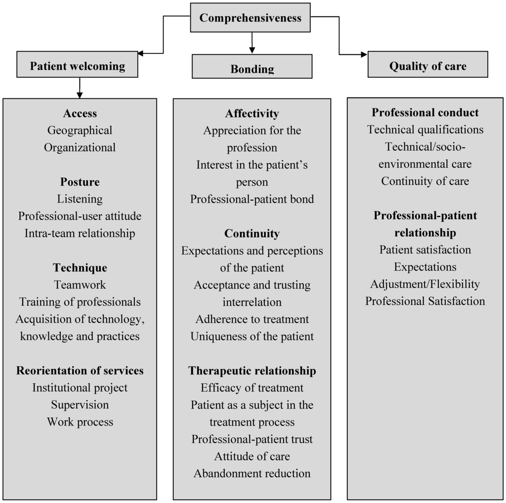 In the initial phase of the research, three key domains in the definition of comprehensiveness of care were discussed: patient welcoming, bonding and quality of care []. Figure 1 illustrates how these domains and their aspects propose a structural link between the concepts of PHC as a way to assess the daily routine of services, professional practices and their relationship with the population [,,,].