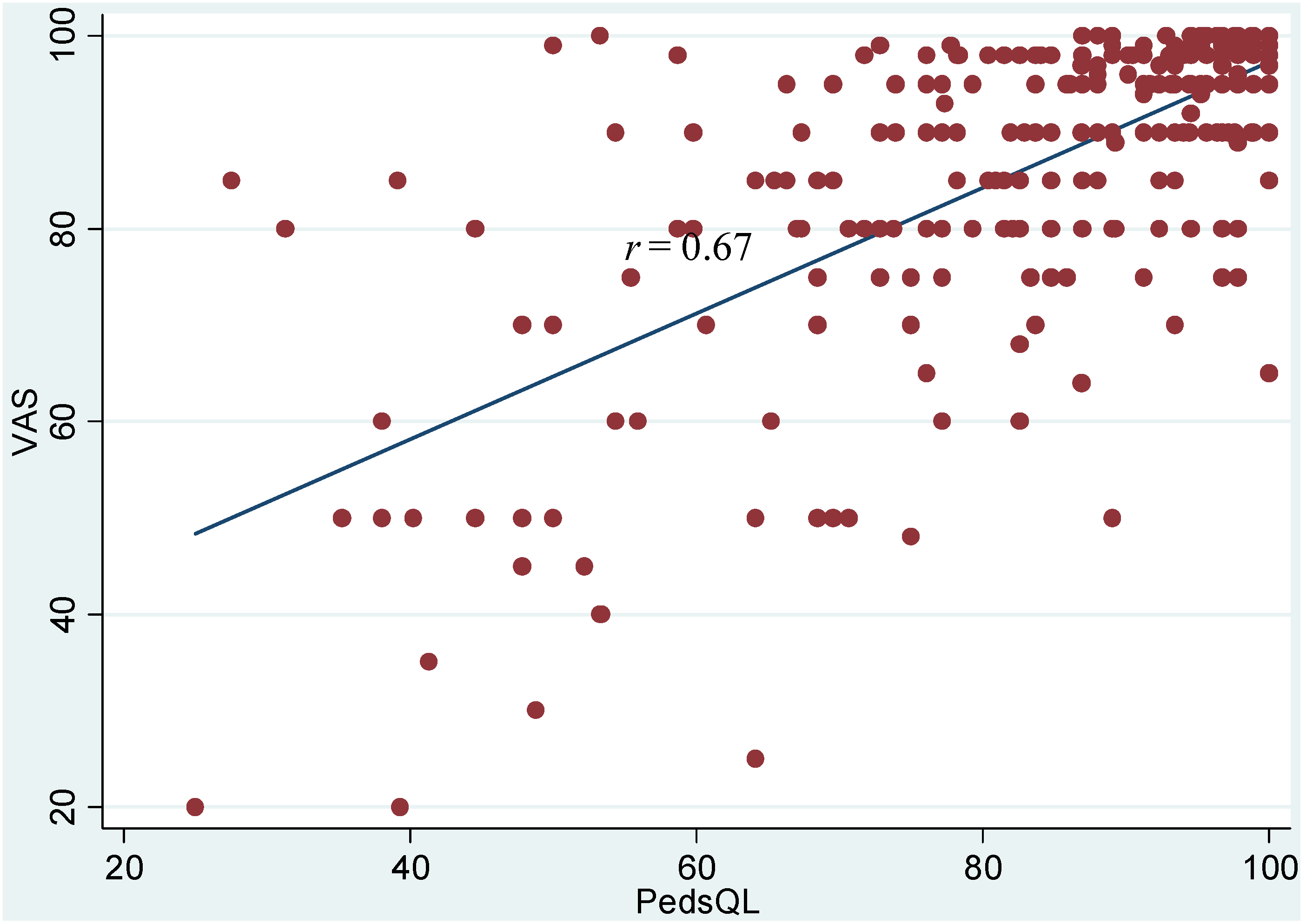 It is important to note that our results may not necessarily generalize to other conditions besides oral clefts such other birth defects or chronic health conditions. To the best of our knowledge, very few studies have reported the correlations between the PedsQLTM and global measures of HRQoL using VAS in other pediatric populations, so there are not many previous results with which we can compare our finding. One study reported a correlation of 0.64 between the PedsQLTM and a general VAS-based measure of wellbeing among children with chronic arthritis [22], which is close to the 0.67 correlation coefficient we found. Replicating this study in other pediatric populations may be of interest to further evaluate the value of VAS as a tool for HRQoL screening and assessment.