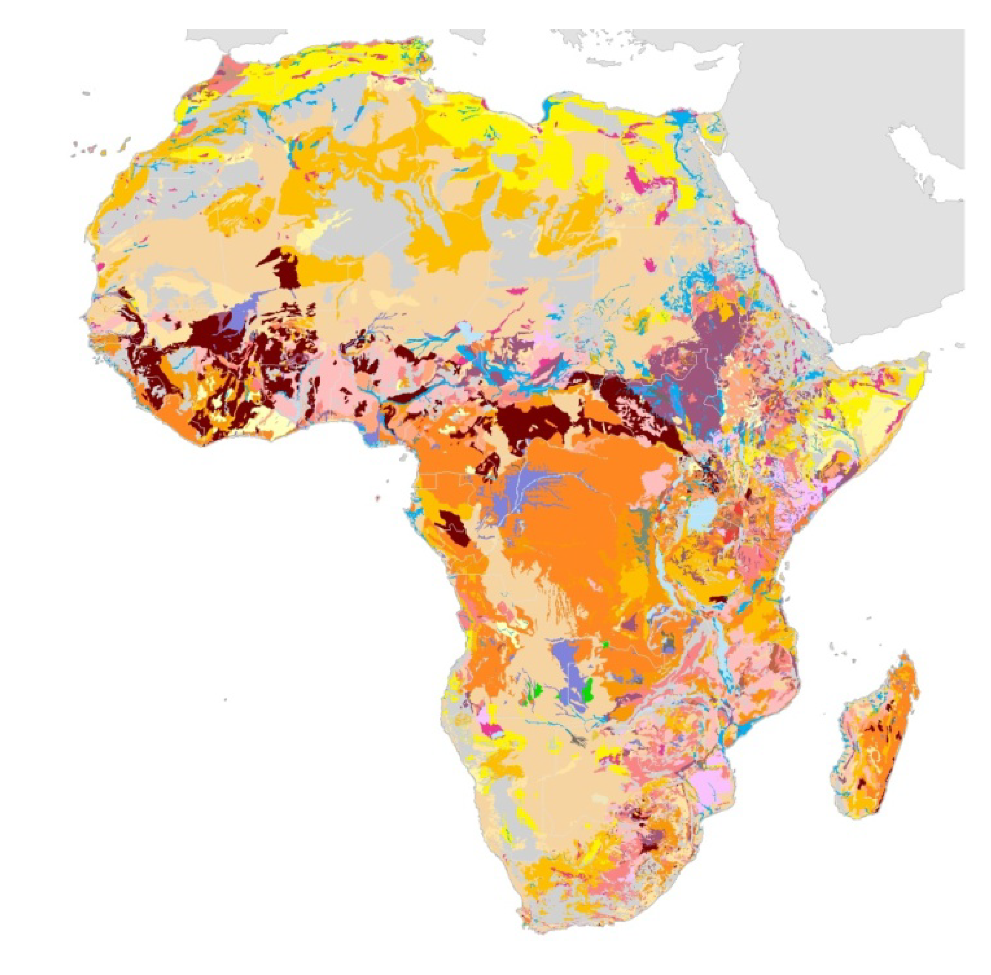 Map of Africa depicting different types of soil. Adapted from European Soil Portal—Soil Data and Information Systems [11].
