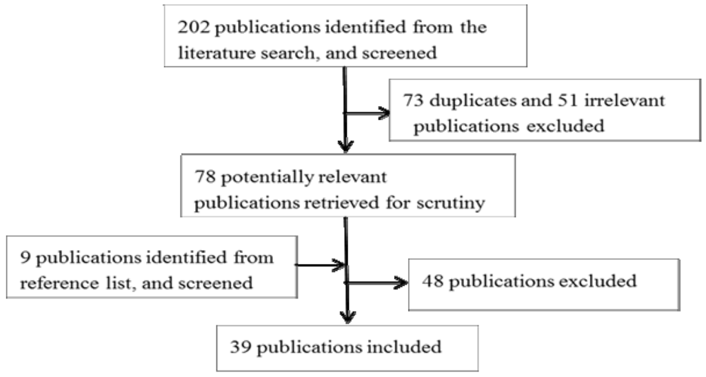 Citations identified in the literature search were screened by title and abstract for decisions about inclusion or exclusion in this review. If there was uncertainty about the relevance of a citation, the full-text was retrieved and checked. A total of 202 publications were identified and were manually screened. If there was uncertainty about whether to include a publication, its relevance was checked by the fourth author. Finally 39 publications that met the inclusion criteria were selected. The screening process is summarized in Figure 2.