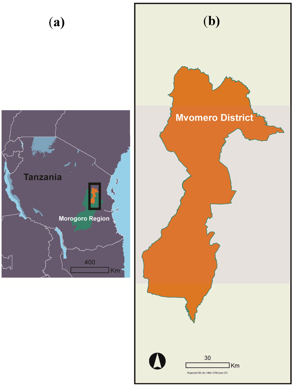 This study was done across 24 villages located in six wards within the northern part of Mvomero district (Mvomero and Turiani divisions), Morogoro region, Tanzania (Figure 1), which is located between latitudes 6–10°S and longitudes 28–37°E, between 293 and 379 meters above sea level, with a total area of 7,325 km2. The district lies on the foothills of Nguru Mountains to the north-west and Uluguru Mountains to the south-east and falls within the Wami River Basin. The study area experiences two rainy seasons running from approximately March through May and October through December, and the average annual rainfall is high at 1,146 mm (the mean from data collected from 1953‒2003), though there is considerable variability across the study area. Malaria is endemic to the study area, with average prevalence in the district estimated at 34.5% in 2005 [24]. In Mvomero district, most adults (80%) are involved in largely subsistence agricultural activities, including rice, maize, and sugarcane production [25].