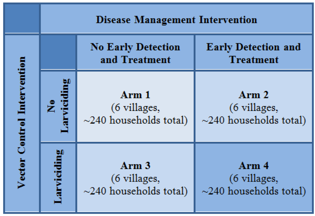 To implement an evaluation of health delivery experiments, the project conducted a large cluster-randomized health delivery experiment in 24 villages. The study sought to evaluate one vector management intervention (larviciding) and one disease treatment intervention (home-based management of malaria consisting of early RDT detection and treatment by village health workers). To assess the individual and combined effects of these two interventions, a 2 × 2 factorial design was developed with six villages randomly assigned to each of four study arms: (1) control/no intervention; (2) early detection and treatment; (3) larviciding intervention; and (4) both early detection and treatment and larviciding (Figure 2). In order to evaluate the effects and effectiveness of these health interventions, household- and individual-level data were collected before and after implementation of the health delivery experiments using household, entomological, and malariometric surveys in addition to local staff reporting on health delivery experiment implementation.