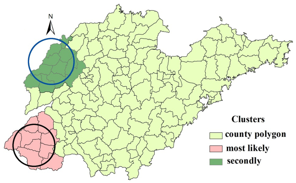 - Kulldorff, M.; Athas, W.F.; Feurer, E.J.; Miller, B.A.; Key, C.R. Evaluating cluster alarms: A space-time scan statistic and brain cancer in Los Alamos, New Mexico. Am. J. Public Health 1998, 88, 1377–1380. [Google Scholar] [CrossRef]