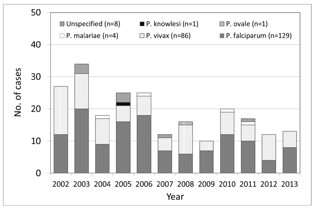 A malaria case was defined as a person with a laboratory-confirmed Plasmodium infection between 2002 and 2013. The laboratory confirmation indicates that malaria parasites were identified either by microscopic examination of a blood film or by PCR that was subsequently confirmed by microscopy [33,34].