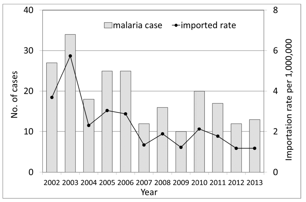 The malaria importation rate was calculated by dividing the number of imported cases reported to the Taiwan CDC by the Tourism Bureau, Ministry of Transportation and Communication, Taiwan based on travel populations and their destinations between 2002 and 2013 [31]. The malaria importation rate was expressed as the number of imported cases per 1,000,000 individuals comprising the travel population.