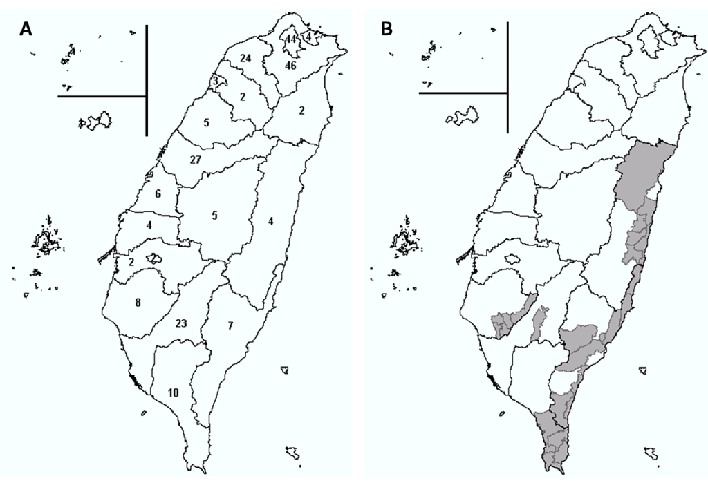 Mosquito survey data for Taiwan was obtained from the Taiwan CDC [32]. From April to September for each year from 2003 and 2006, two to three villages were surveyed each month. On each visit, a larval survey was conducted using 14-cm diameter dippers along the banks of streams and ditches around or in the surveyed village. Two teams collected adult mosquitoes along the bank and its surroundings for 1 h between 10:00 and 12:00. All of the collected mosquitoes were stored in a dry ice box and brought back to the laboratory for species identification. Blood-fed mosquitoes were kept at −20 °C for blood meal identification [15,32].