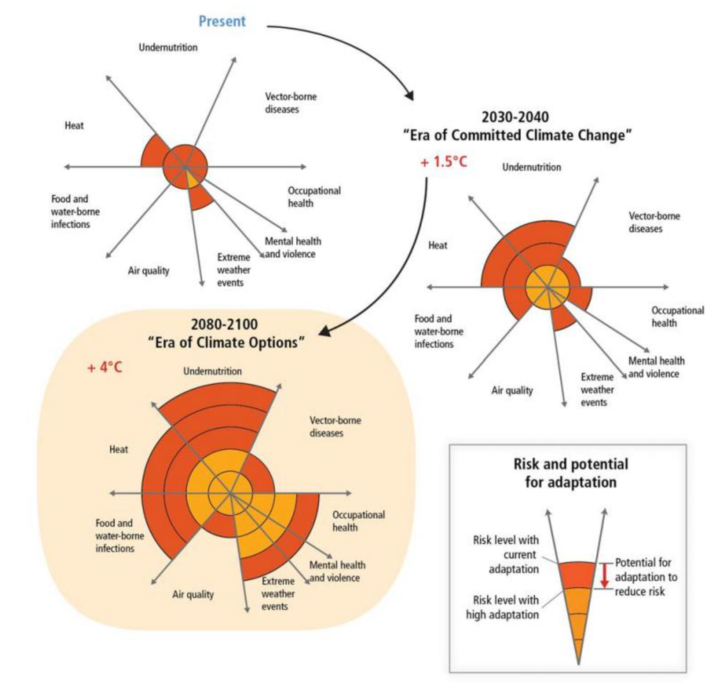 Note: Impacts are identified in eight health-related sectors based on assessment of the literature and expert judgments by authors of Chapter 11 of IPCC WGII AR5 [1]. The width of the slices indicates in a qualitative way the relative importance in terms of burden of ill-health globally at present and should not be considered completely independent. Impact levels are presented for the near-term era of committed climate change (2030–2040), in which projected levels of global mean temperature increases do not diverge substantially across emissions scenarios. For some sectors, e.g., vector-borne diseases, heat/cold stress, and agricultural production and under-nutrition, there may be benefits to health in some areas, but the net impact is expected to be negative. Estimated impacts are also presented for the longer-term era of climate options (2080–2100), for global mean temperature increase of 4 °C above preindustrial levels, which could potentially be avoided by vigorous mitigation efforts taken soon. For each timeframe, impact levels are estimated for the current state of adaptation and for a hypothetical highly adapted state, indicated by different colours.