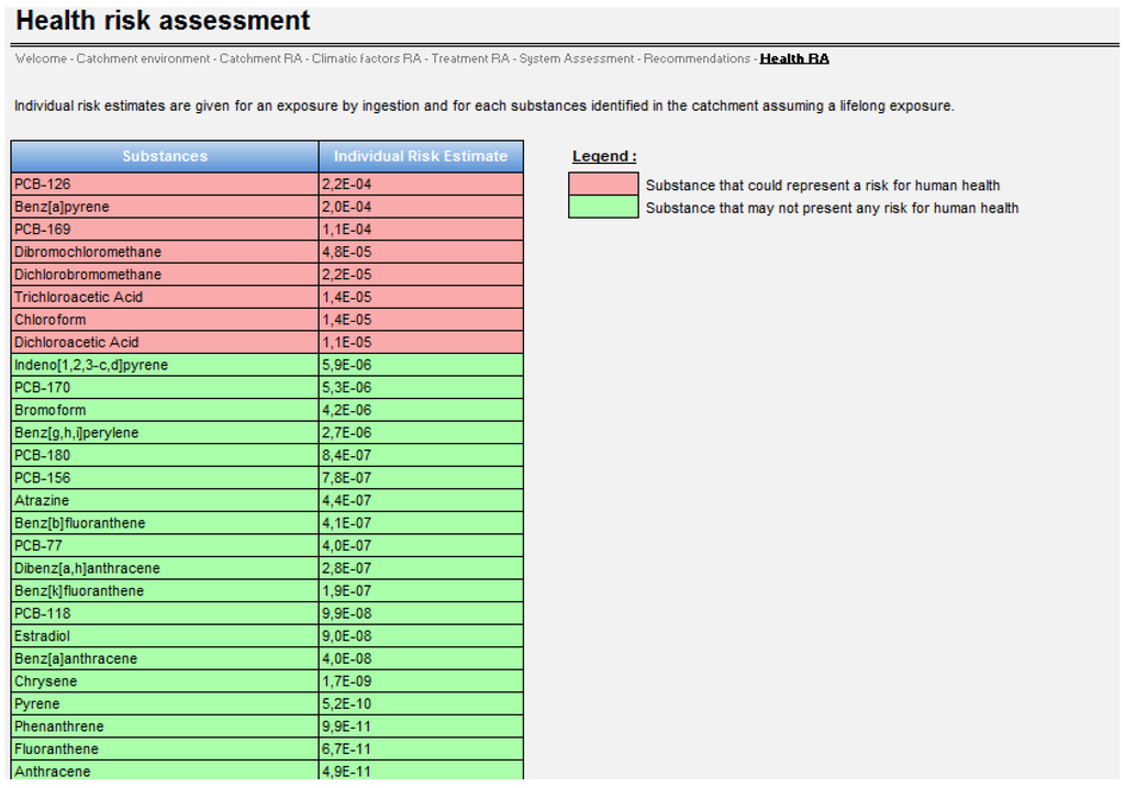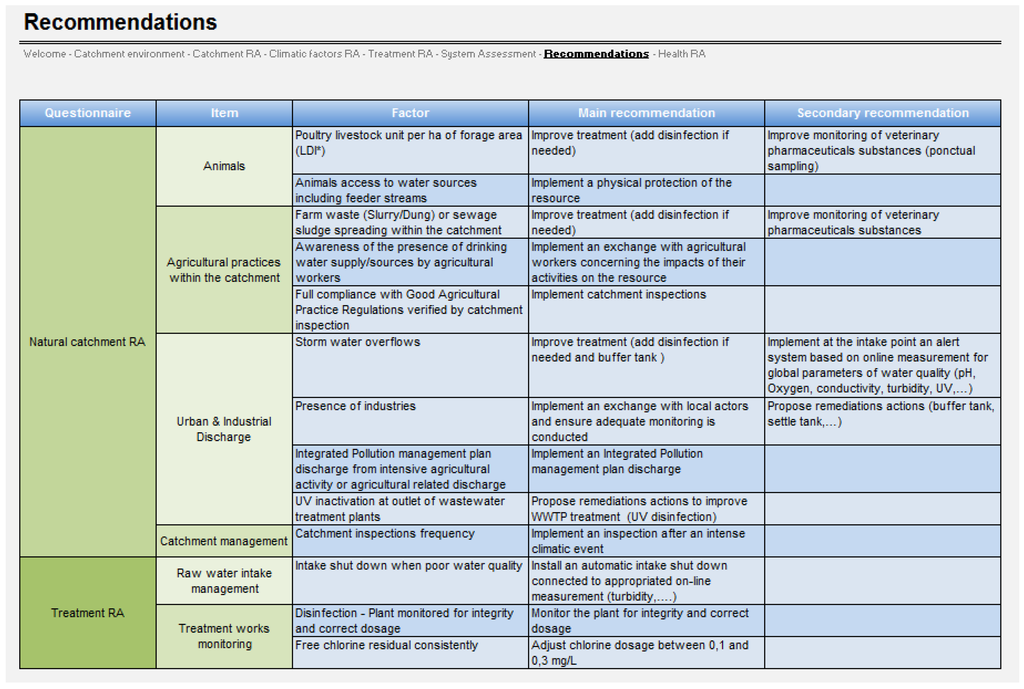 | United Kingdom (Scottish executive) | 2003 | Private water supplies : Technical Manual | Semi quantitative RA | 1–50 50–1000 | All pressures (wild life, agriculture, forestry industry, wastewater, sludge, landfill | Risk scoring Recommendations |