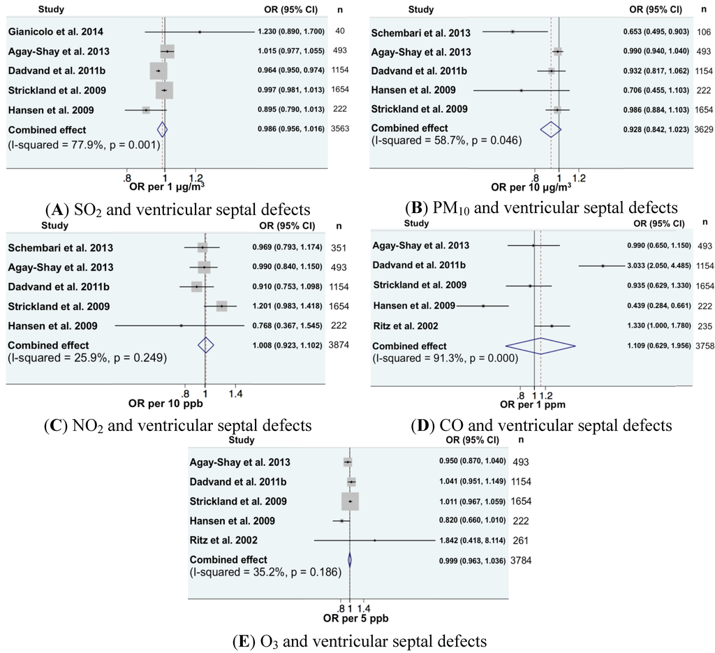 Forest plots for combinations of ventricular septal defects and pollutant (as a continuous variable). The size of each square represents the weight that contributes to the combined effect, respectively for: (A) SO2; (B) PM10; (C) NO2; (D) CO; and (E) O3.