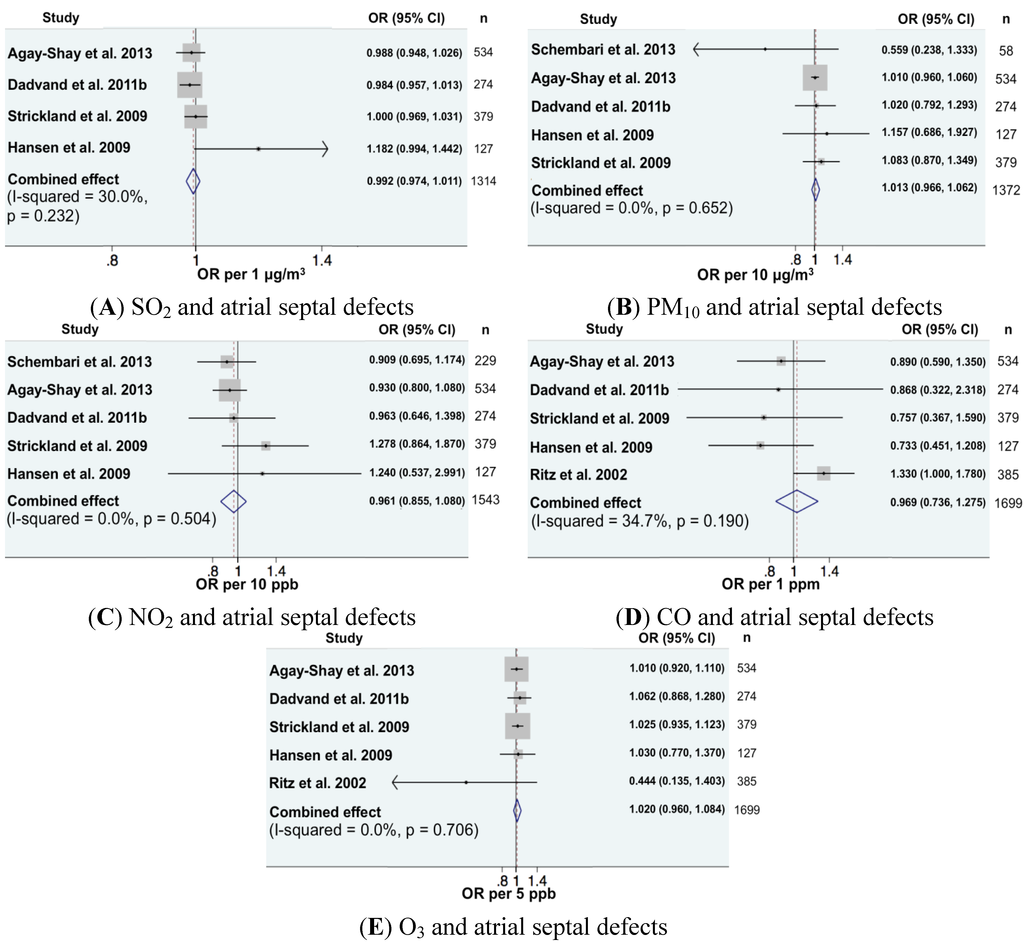 Forest plots for combinations of atrial septal defects and pollutant (as a continuous variable). The size of each square represents the weight that contributes to the combined effect, respectively for: (A) SO2; (B) PM10; (C) NO2; (D) CO and (E) O3.