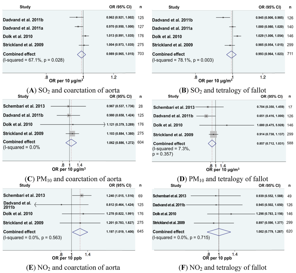 However, these authors revealed a significantly increased risk between exposure to NO2, SO2 and the tetralogy of fallot (OR per 10 ppb NO2 = 1.25, 95% CI (1.02–1.51); and OR per 1 ppb SO2 = 1.04, 95% CI (1.00–1.08), respectively) and coarctation of aorta (OR per 10 ppb NO2 = 1.20, 95%CI (1.00–1.44); OR per 1 ppb SO2= 1.04; 95% CI (1.00–1.08)). We did not undertake the meta-analysis for these combinations because the number of studies was small. In the present work, we chose to realize two-separate meta-analyses according to the type (continuous or categorical) of the exposure variable, not to introduce too much heterogeneity in the meta-estimates, whereas Vrijheid et al. converted all continuous to categorical variables in order to increase their statistical power.