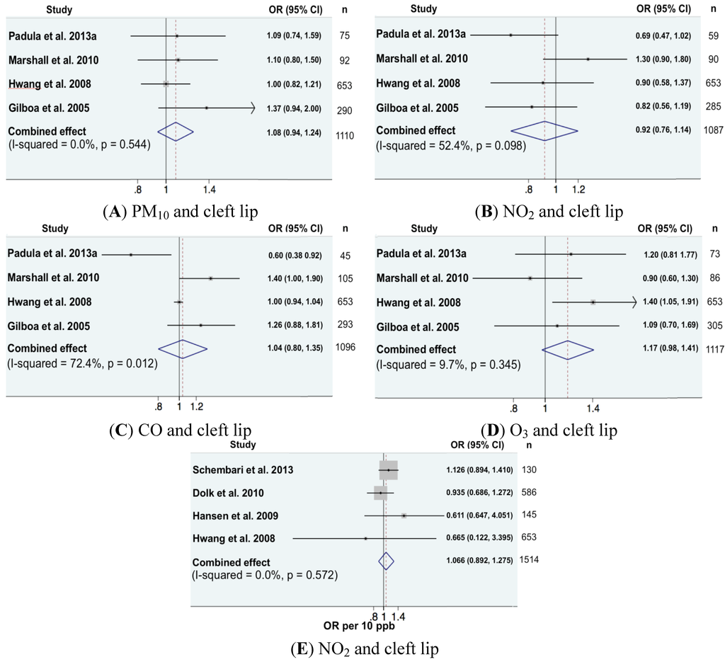 Forest plots for a variety of pollutants and risk of orofacial defects. (A), (B), (C) and (D) showed combined effects of PM10, NO2, CO and O3; (E) was the combined effect of NO2 and cleft lip from continuous exposure risk estimates.