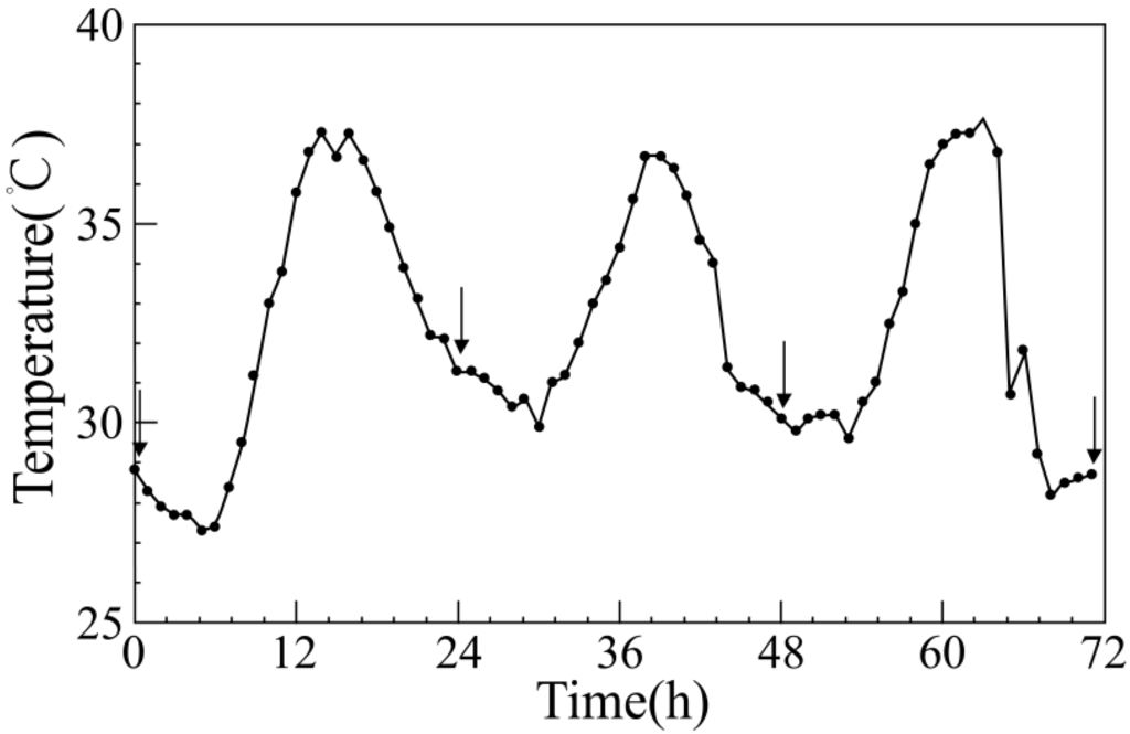 Hourly meteorological data (temperature, humidity, and precipitation) were collected in Nanjing during the summer seasons (June to August) from 2001 to 2010. According to the China Meteorological Administration criteria, a maximum temperature ≥35 °C on any given day is called high temperature, and three or more consecutive days of high temperature are called a heat wave. A heat wave model was developed based on a heat wave that occurred in July 2001 in Nanjing. The temperature simulation curve is shown in Figure 1. The daily average temperature was 31.8 °C; the average maximum temperature was 36.6; the average duration of heat waves in three days was 5.7 hours. Experiments started from 0 o’clock on 9 July 2001 and ended at 24 o’clock on 11 July. The experimental temperature of the control group was set at 27 °C, which was the average summer temperature in Nanjing from 2001 to 2010.