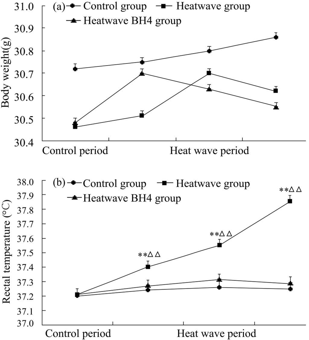 The body weights and rectal temperatures of senile mice were monitored daily during the 3 d of the experiment. Figure 2 shows that the body weights in all three groups slightly increased by the end of the experiment (p > 0.05). Mice in each group showed increased rectal temperature with the progression of the heat process between the start and the end of the experiment. Rectal temperature significantly increased by 0.65 °C in the heat wave group, whereas that of the heat wave BH4 and control groups slightly increased by 0.07 °C and 0.05 °C, respectively. Rectal temperature increases in the heat wave group were significantly higher than those in the control group (p < 0.01), but the rectal temperature differences between the heat wave BH4 and control groups were not statistically significant (p > 0.05).