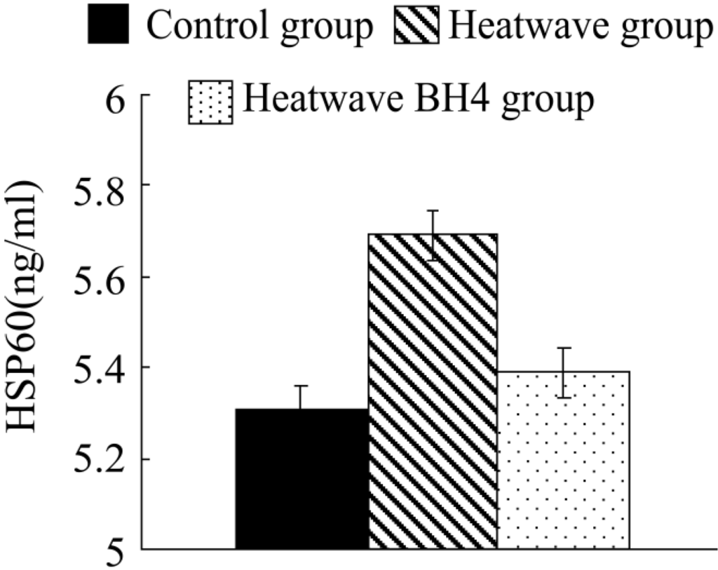 The HSP60 levels in senile mice cardiac tissues of different groups in heat wave experiments (Figure 3) illustrated: compared with the control group, these HSP60 values of the two groups have different increasing in different degrees by 0.382 and 0.081 ng/mL respectively, while that of the wave BH4 group were 0.381 ng/mL lower than those of the heat wave group, with no significant difference. In conclusion, the heat wave could induce the increments of HSP60 in myocardial tissues of senile mice.