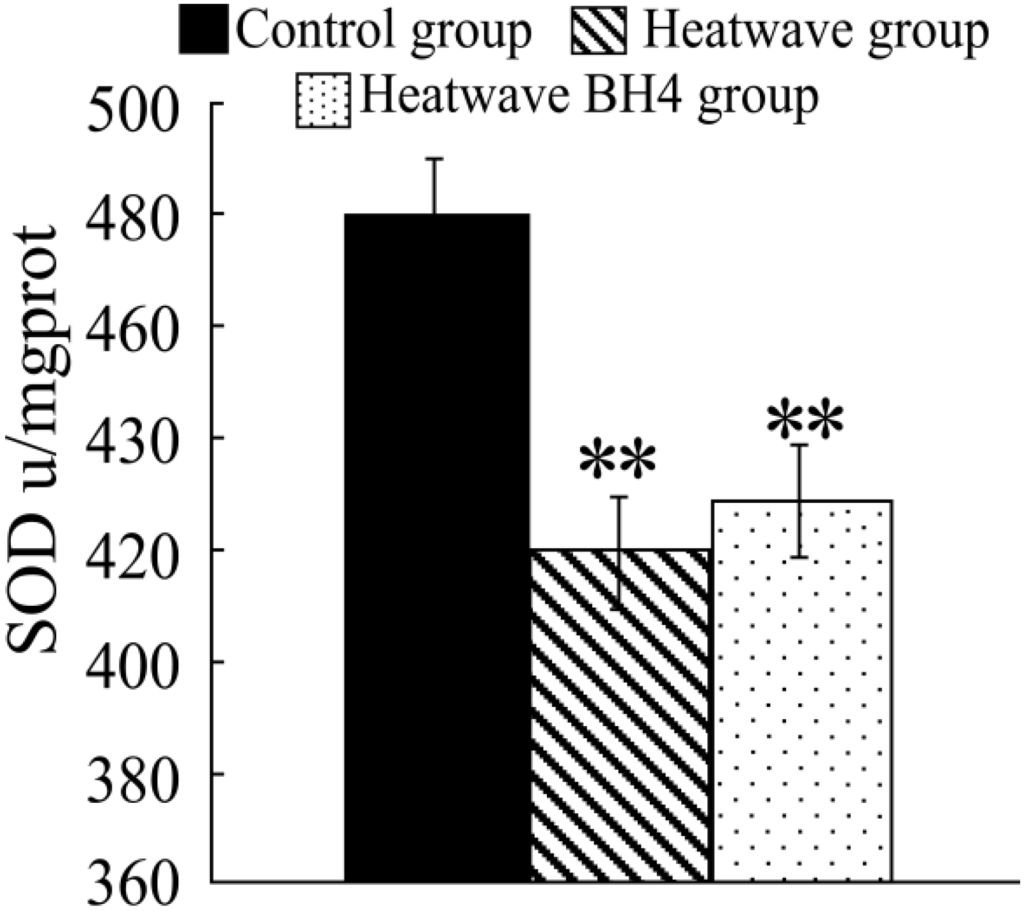 SOD is an important indicator that maintains oxidative balance and vascular endothelial function in the body [7,16,36]. This experiment showed that the heat stimulation can significantly decrease the SOD activity in cardiac tissues of senile mice. BH4 could mitigate the effect of heat waves on SOD activity. The exogenous balance of BH4 may reduce the harm of heat waves on cardiovascular of senile mice.