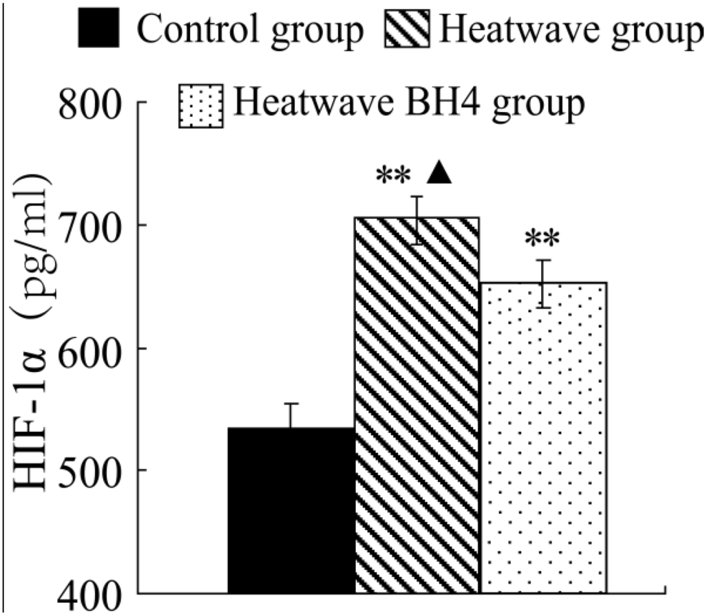 BH4 can relieve the increased expression of inflammatory factors caused by heat wave stimulation, thereby protecting the cardiovascular system. This study showed that Heat waves can induce the increment of HIF-1α expression in senile mice. Cramer et al. [40] demonstrated through in vitro bone marrow cell experiments that HIF-1α is the key factor in the adhesion and migration of invasion, and HIF-1α deletion may inhibit inflammation. Sluimer et al. [33] demonstrated that carotid atherosclerotic plaques increase the occurrence of hypoxia and HIF-1α expression, leading to the further development of atherosclerosis. Thus, heat stimulation can increase the risk of cardiovascular disease by inducing the expression of HIF-1α in myocardial tissues BH4 while supplementation can alleviate the effect caused by thermal stimulation and provides protective effects to the body.