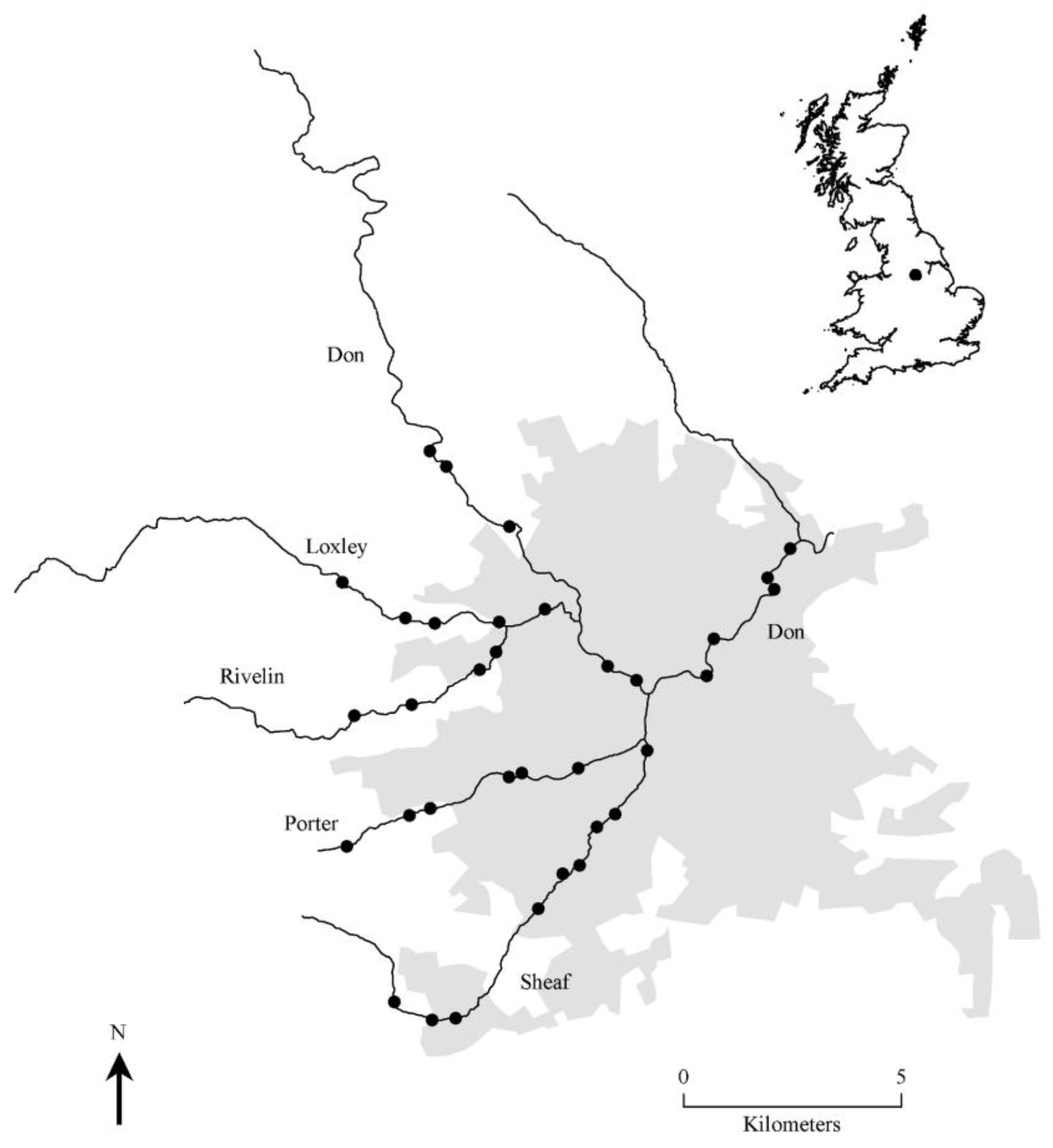 The urban area of Sheffield, United Kingdom (shaded), showing the major rivers running through the city (solid lines) and study sites (filled circles). The inset shows the location of Sheffield in Britain.
