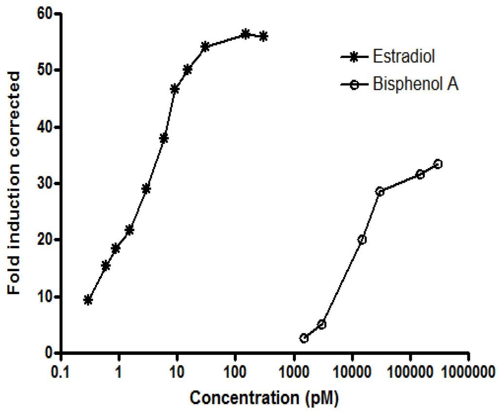 The positive and negative control compounds used in this study behaved as expected with the S. cerevisiae BMAEREluc/ERα yeast strain. Both positive controls (estradiol and bisphenol A) produced a sigmoidal dose-response curve (Figure 1), while the negative controls (progesterone and testosterone) did not elicit any luciferase activity in the test system. This is in keeping with previously published data [,]. The limit of detection (LOD) in the yeast bioluminescent assay was 2.4-fold induction corrected (FIC), corresponding to 76 fM and 1.2 nM of estradiol and bisphenol A, respectively.