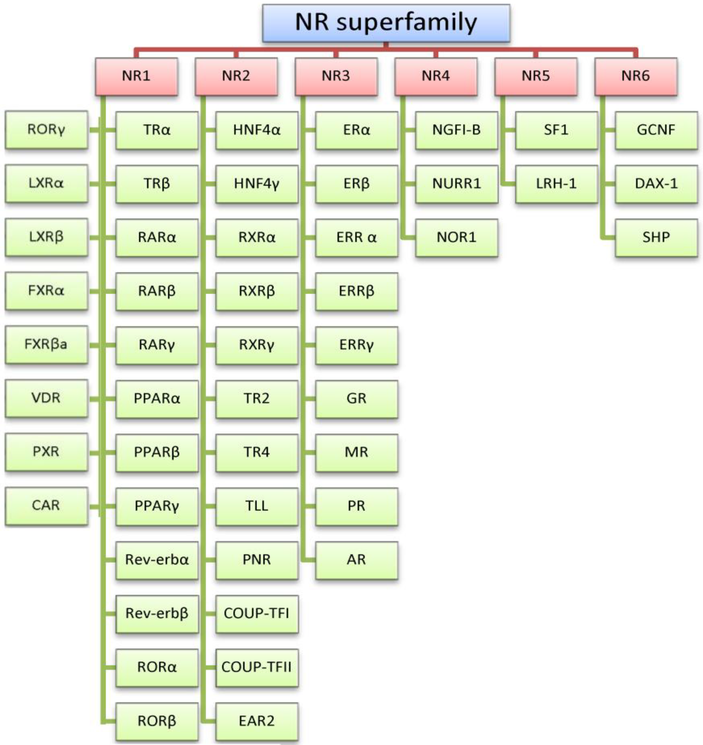 NR1 consists of TR: thyroid receptor; RAR: retinoic acid receptor; PPAR: peroxisome proliferator-activated receptor; ROR: retinoic acid related orphan nuclear receptor; LXR: liver X receptor; FXR: farnesoid X receptor; VDR: vitamin D receptor; PXR: pregnane X receptor and CAR: constitutive androstane receptor. Note: no full terminology for Rev-erb. NR2 consists of HNF: hepatocyte nuclear factor; RXR: retinoid X receptor; TR: testicular receptor; TLL: tailless-like receptor; PNR: photoreceptor-specific nuclear receptor; COUP-TF: chicken ovalbumin upstream promoter transcription factor and EAR: ErbA-related protein. NR 3 consists of ER: estrogen receptor; ERR: estrogen-related receptor; GR: glucocorticoid receptor; MR: mineralocorticoid receptor; PR: progesterone receptor and AR: androgen receptor. NR4 consists of NGFI-B: nerve growth factor-induced clone B; NURR: Nur-related factor and NOR: neuron-derived orphan receptor. NR5 consists of SF1: steroidogenic factor 1 and LRH: liver receptor homolog. NR6 consists of GCNF: germ cell nuclear factor; DAX-1: dosage-sensitive sex reversal-adrenal hypoplasia congenital critical region on the X chromosome protein 1 and SHP: small heterodimer partner. Table adapted from [19,20].