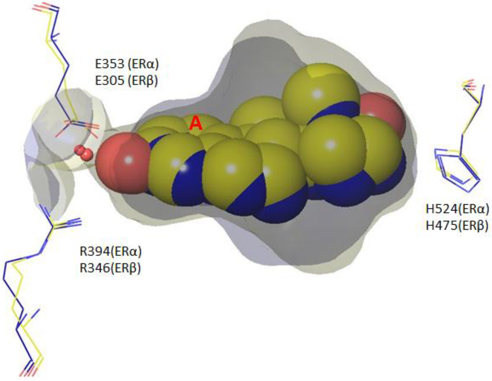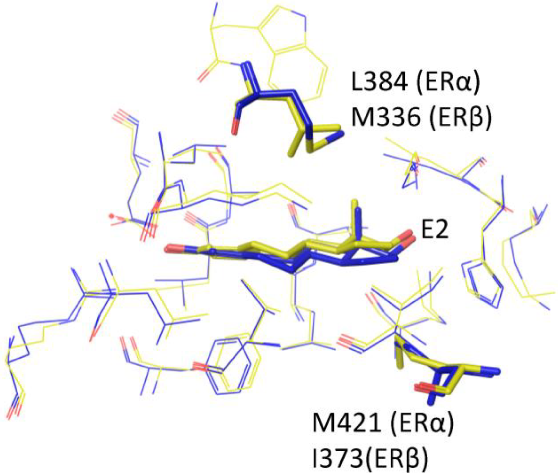 17β-estradiol (E2) bound to ERα (yellow) and ERβ (blue). Only two residues, i.e., L384/M336 and M421/I373 (Erα/ERβ), differ in the binding pockets of ERα and ERβ. Unsurprisingly, the E2 binds in the subtypes in only subtlely different manners.