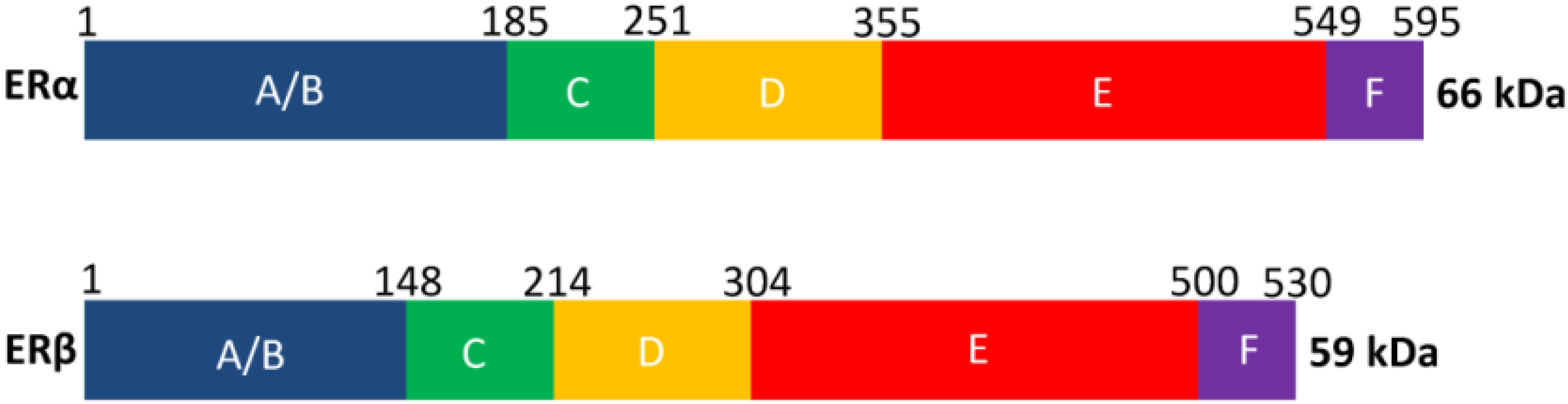 Domains A-F of ERα and ERβ, each playing a different structural/functional role. The numbers above the bars denote the residue numbers in the two receptor subtypes. ERα is slightly larger than ERβ, with a total of 595 amino acids (66 kDa) compared to 530 amino acids (59 kDa) for ERβ.