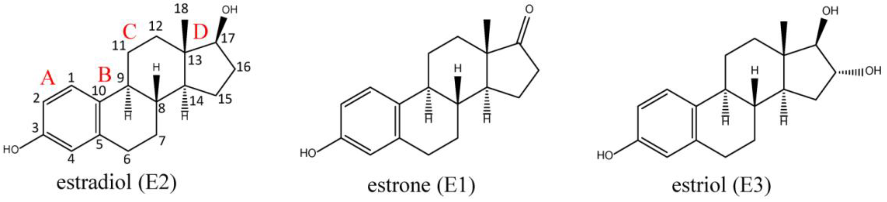 - Anstead, G.M.; Carlson, K.E.; Katzenellenbogen, J.A. The estradiol pharmacophore: Ligand structure-estrogen receptor binding affinity relationships and a model for the receptor binding site. Steroids 1997, 62, 268–303. [Google Scholar] [CrossRef]