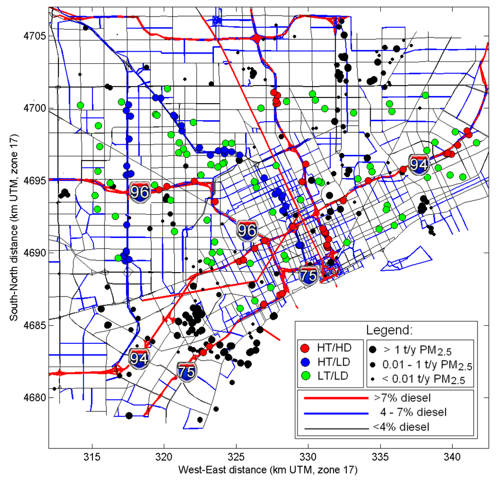 30]. In this study, detailed information including the geometry of the road network, traffic volumes, temporal allocation factors, fleet mixes and pollutant-specific emission factors, assembled from a variety of sources, were used in combination with meteorological inputs to generate link-based emissions for use in dispersion modeling to estimate pollutant concentrations due to traffic [