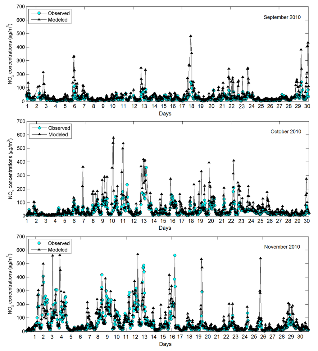 x concentrations at the “East 7 mile” site for September–November 2010. Modeled concentrations generally follow the time series of observed data, however there are some over-predictions at certain hours likely due to uncertainties in emissions from traffic. The monitoring site is away from major highways, therefore the observed concentrations are influenced by emissions from local roads and regional sources. Unlike major highways, estimating emissions from local roads is more challenging because of uncertainties in road locations, traffic activity and fleet distribution. The results of statistical analyses (