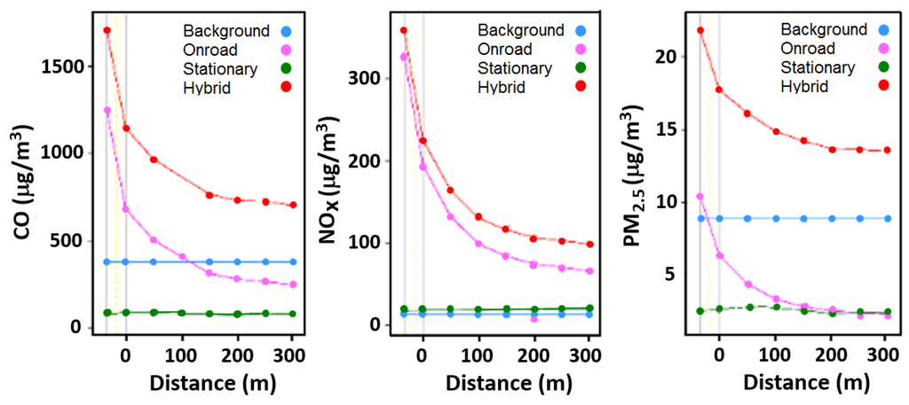 2.5) at the modeled receptor site near I-94. However, the background contribution is different for these pollutants. For CO, the roadway contribution is high within 100 m from the roadway, but after 100 m it diminishes to levels below the background. For NO