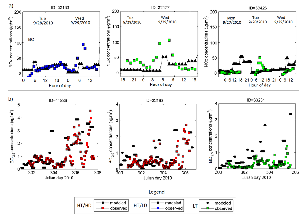 x concentrations. However, at some sites and for some specific hours, the model under-predicts concentrations (e.g., at site ID = 33,133 or ID = 32,177, 6–8 a.m. on 29 September 2010) or over-predicts (e.g., at site ID = 33,426, 6–8 a.m. on 29 September 2010) concentrations at some locations. This discrepancy can be explained by the uncertainty in hourly traffic activity at the road link level. Typically, time-resolved traffic information at a link level is not available and sophisticated algorithms are used to estimate such traffic emissions for individual road links. Nevertheless, except for some events, the model can capture the magnitude and time patterns of near road pollutant concentrations, critical for the exposure and health studies. For BC, the model performance was similar to NO