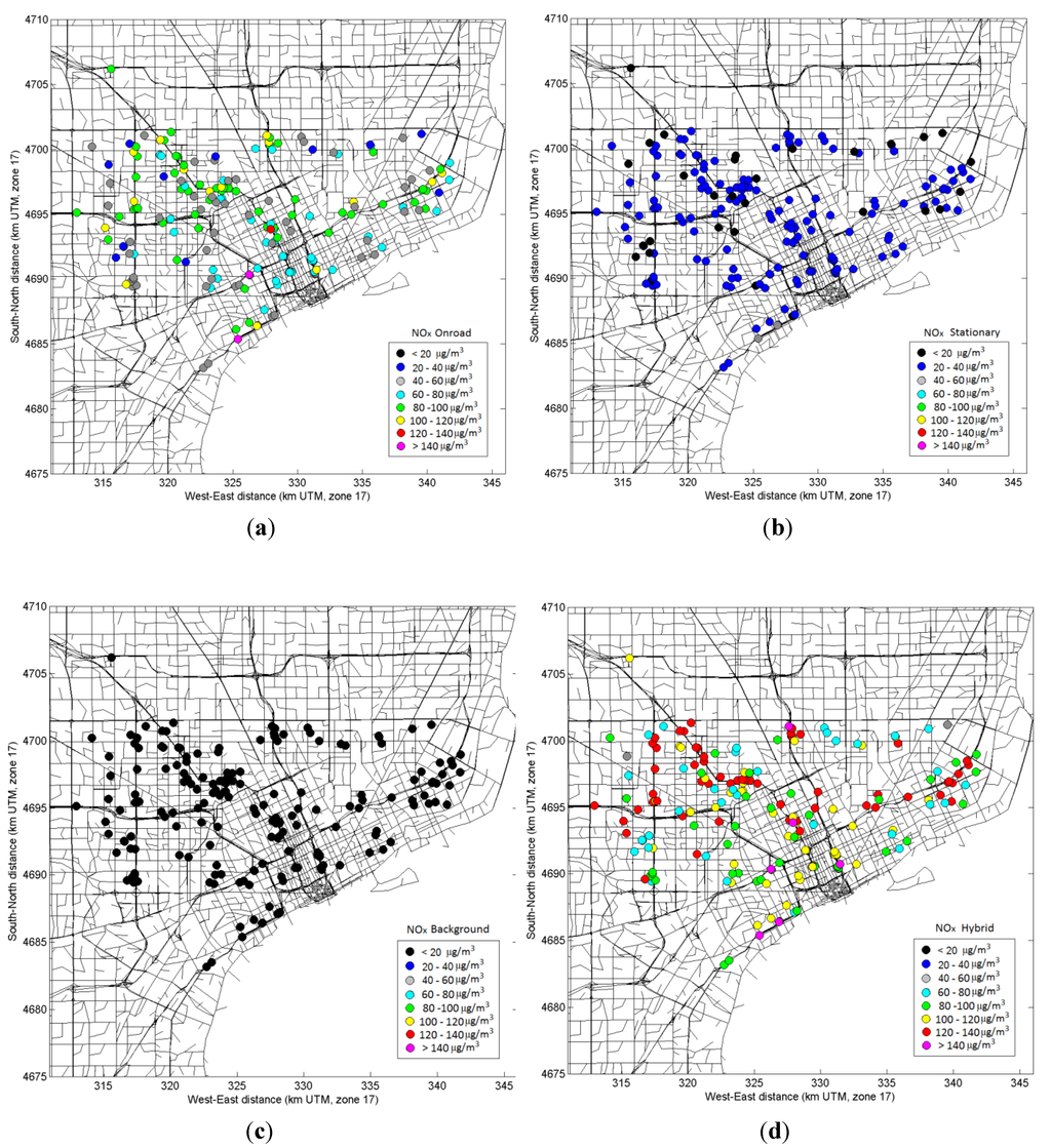 23]. Air quality modeling was included in the design of NEXUS to estimate exposure to traffic-related air pollutants that varied both spatially and temporally. Exposure estimates will be used for evaluating associations with daily health measurements collected during a 14-day period in each of four seasons for each study participant over a 1.5 years period. This paper describes application of the hybrid air quality modeling approach. The hybrid modeling components are described along with the specific inputs used for application to the Detroit study area and NEXUS participant locations. Model results are compared with available measurement data from regulatory monitoring sites within Detroit and intensive field studies conducted during NEXUS. The various exposure metrics produced from the model output which include the mobile source contribution to total exposure are provided for use in related NEXUS epidemiologic analysis, and described and compared here.