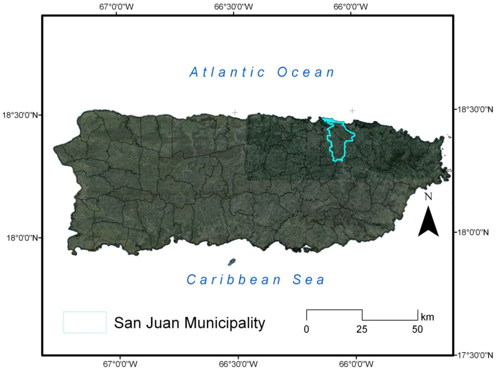 Puerto Rico is an island located in the northern-central Caribbean Sea (17.92°N–18.52°N, 65.62°W–67.28°W). The municipality of San Juan, located in the northeast sector of the island, is the capital in Puerto Rico and an urban coastal area (Figure 1). San Juan has a subtropical humid climate; with an annual average rainfall of ~1800 mm. Easterly trade winds prevail most of the year over the island, with local winds influenced by the diurnal heating cycle. A sea breeze is observed along the north, south, and west coastal sections [25]. Average air temperatures range from 22–28 °C [9,26].