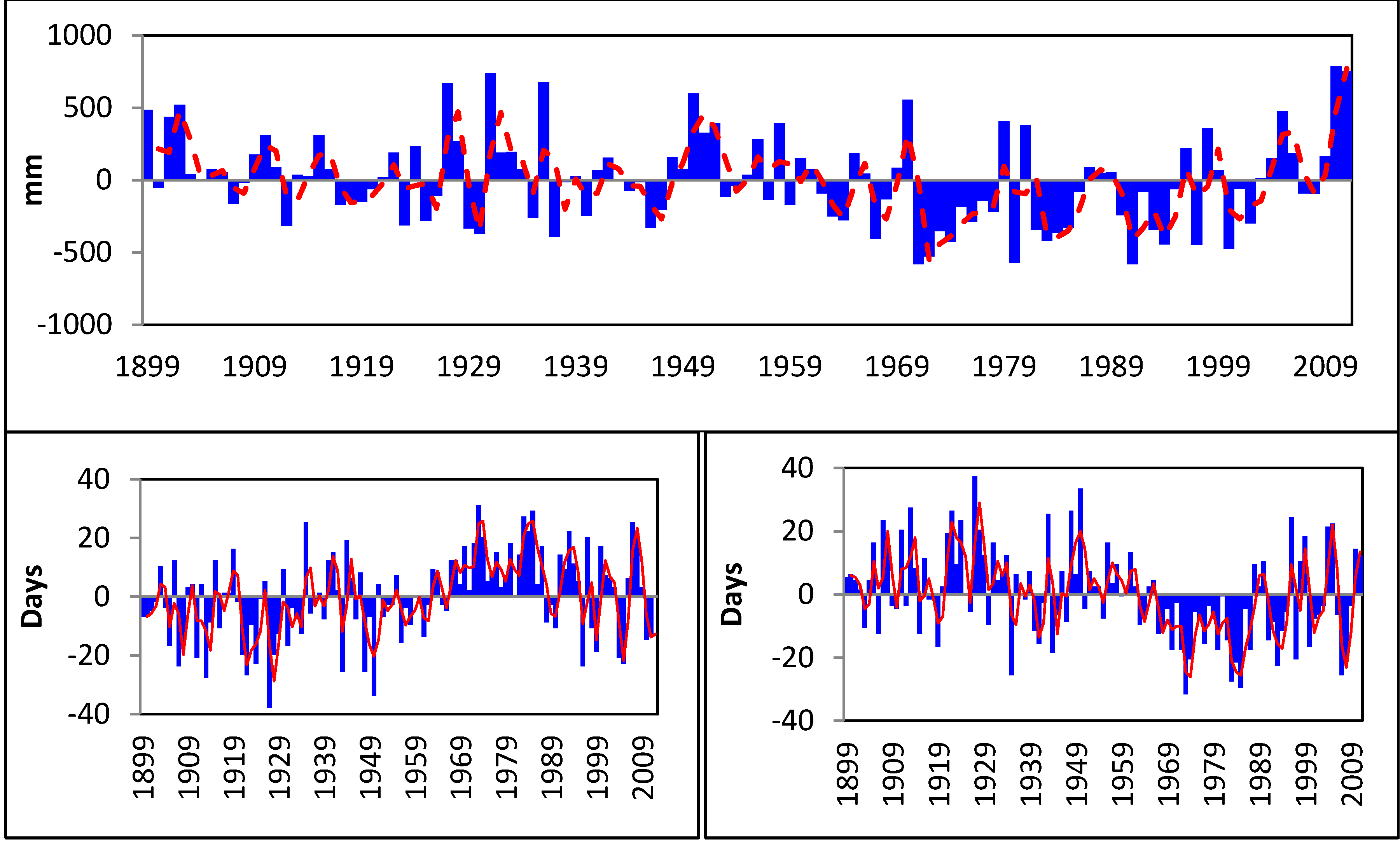Upper Panel: Annual rainfall anomaly (blue bars) and moving average (red broken line). Lower Left: Anomalies for dry days (blue bars) and moving average (red line); Lower Right: Anomalies for wet days (blue bars) and moving average (red line); 1899–2011.