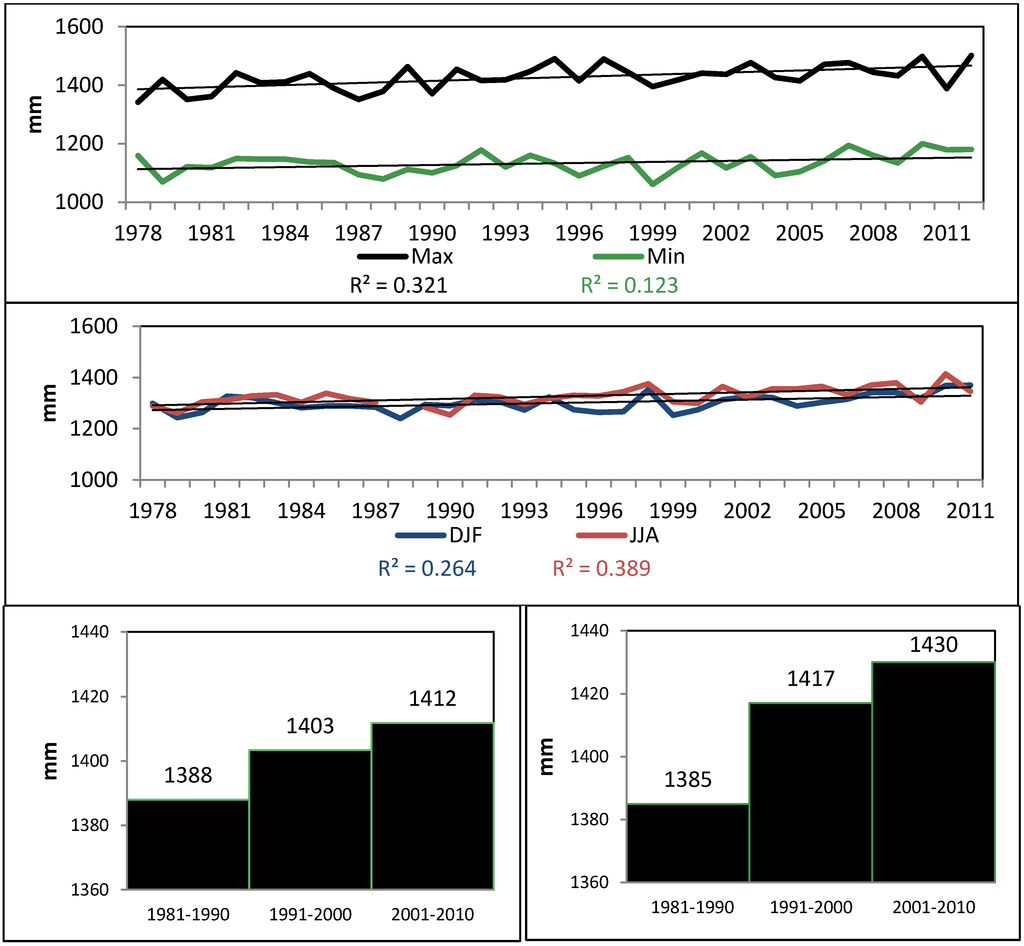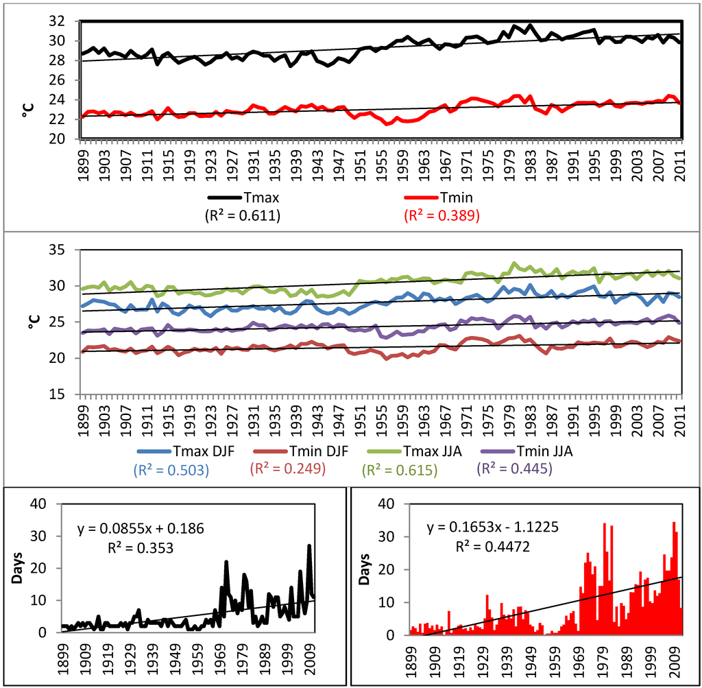 A significant positive trend was observed in annual mean maximum and minimum air temperatures, as well as in seasonal minimum and maximum temperature extremes (Figure 3). The entire Caribbean region warmed significantly over the period 1961–2009 [13,43]. The annual percentage of warm days and nights, analyzed through the TX90p and TN90p indices, has significantly increased. Our results are also consistent with trends observed over parts of northern South America, where nighttime (minimum) temperature indices show the largest rates of warming [44]. Daytime (maximum) temperature indices also show warming over much of South America, but at lower rates.