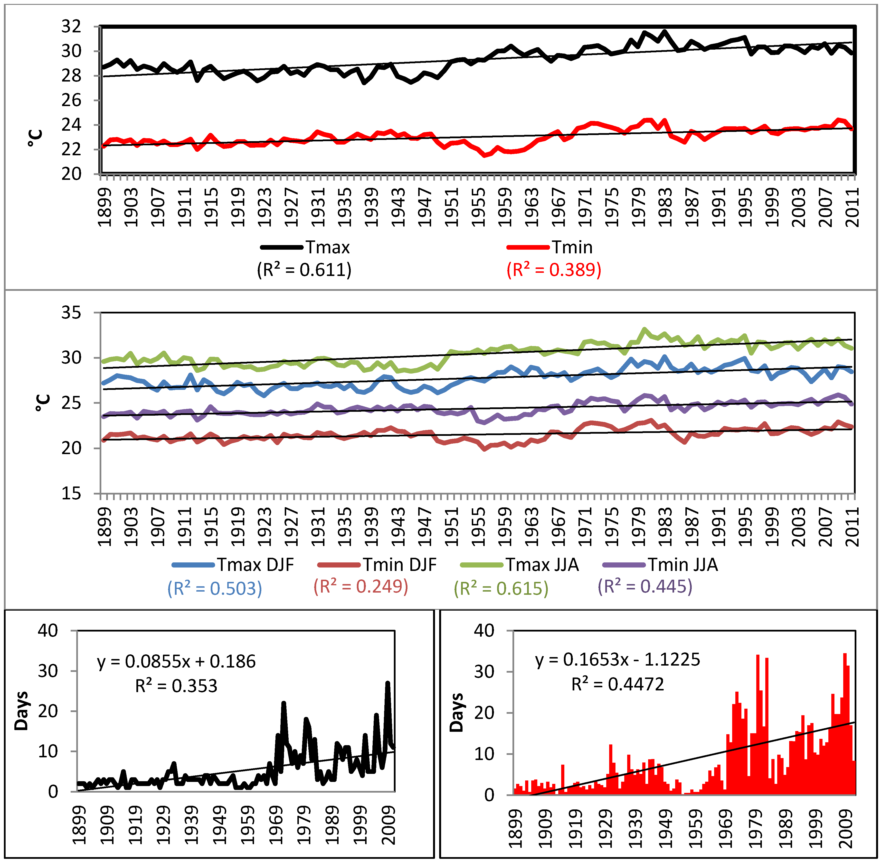 Upper Panel: Time series of annual average minimum and average maximum air surface temperature. Middle: Seasonal Trends in annual average minimum and maximum air temperature. DJF indicates December-January-February and JJA indicates June-July-August. Lower Left: Consecutive days > 90th percentile Tmin (25 °C). Lower Right: TN90p (San Juan 1899–2011).