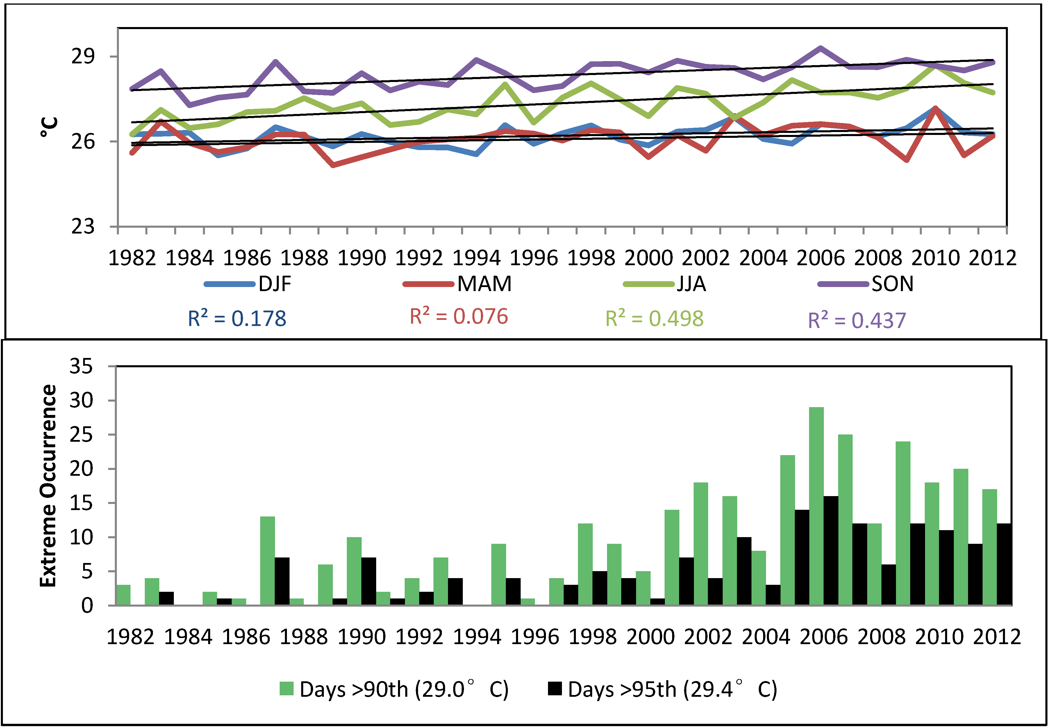 Top Panel: Seasonal Sea Surface Temperature trends (AVHRR Pathfinder v5.2 SST, extracted in a 4x4 km2 area in the Atlantic Ocean immediately off San Juan 1981–2012). Lower Panel: Number of days showing extremely high SST (above the 90th percentile: 29 °C, and 95th percentile: 29.4 °C).