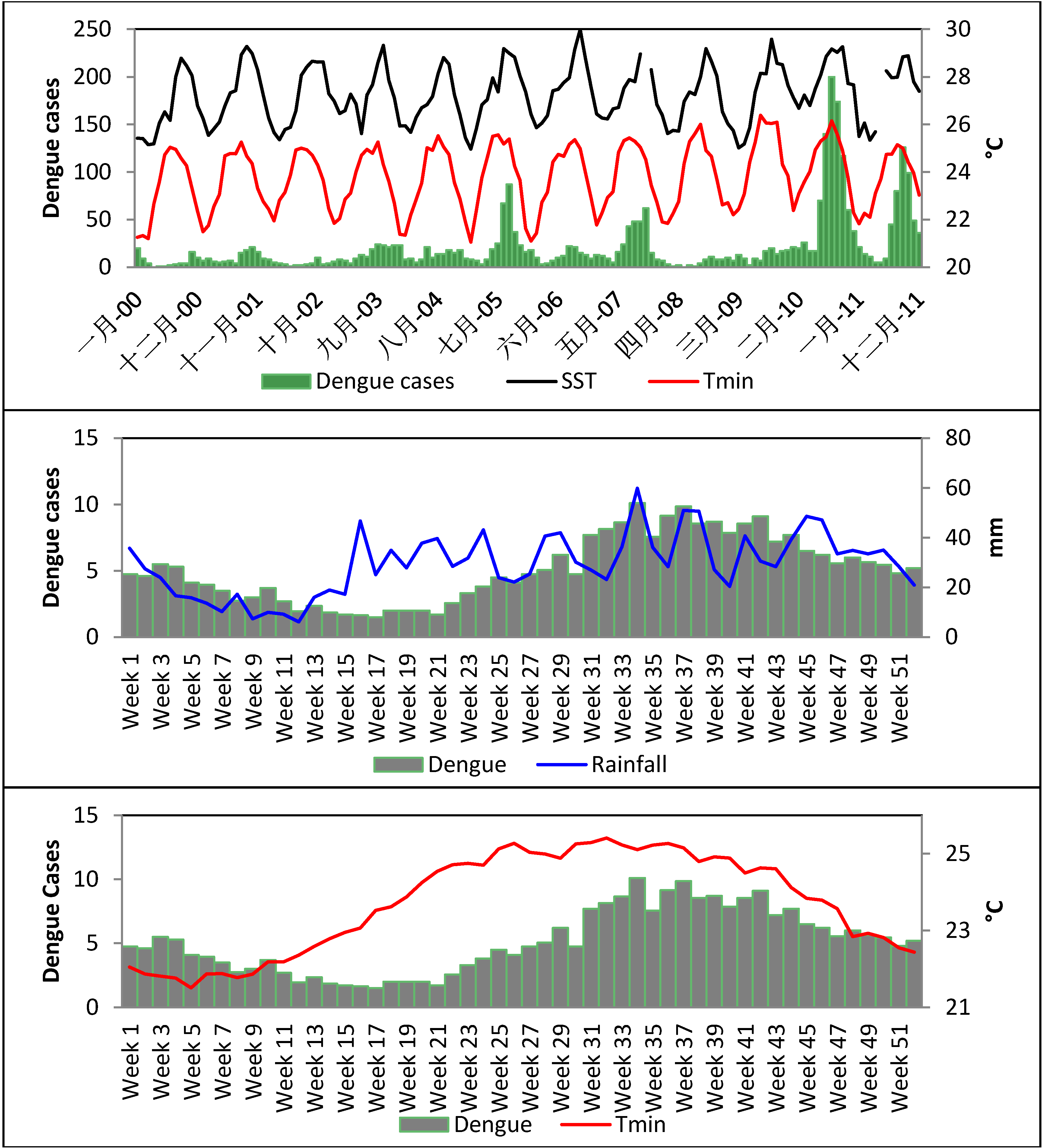 | Periods | Variables | Dengue Cases | SST | SLP | Rainfall | Tmax | Tmin | MSL |