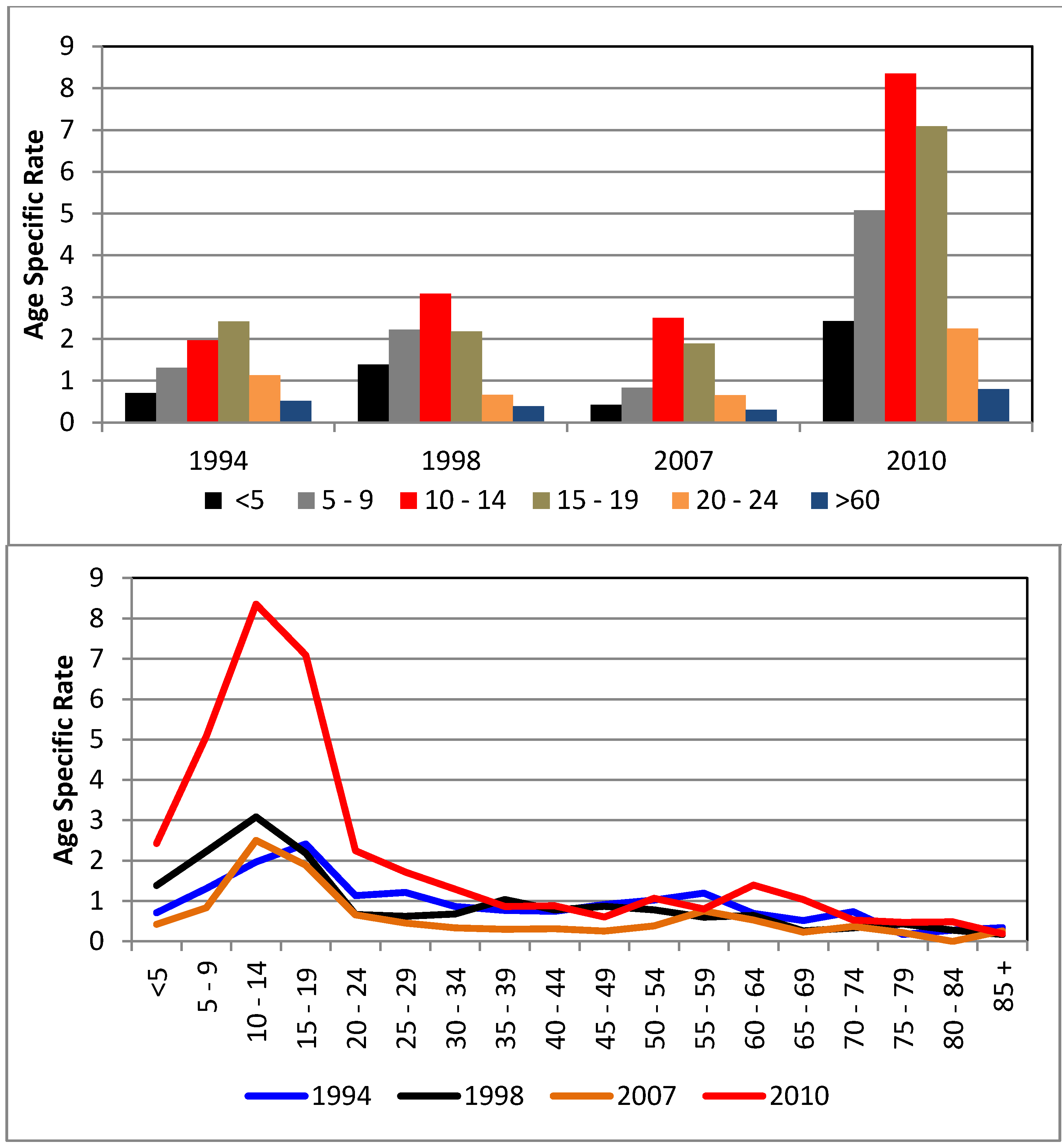 Comparison of age-specific dengue incidence rates per 1000 inhabitants in epidemic years (1994, 1998, 2007, and 2010) in San Juan. Upper Panel: Age-specific dengue incidence rates (age groups <24 years old and >60 years old). Lower Panel: Age-specific dengue incidence rates (all age groups).