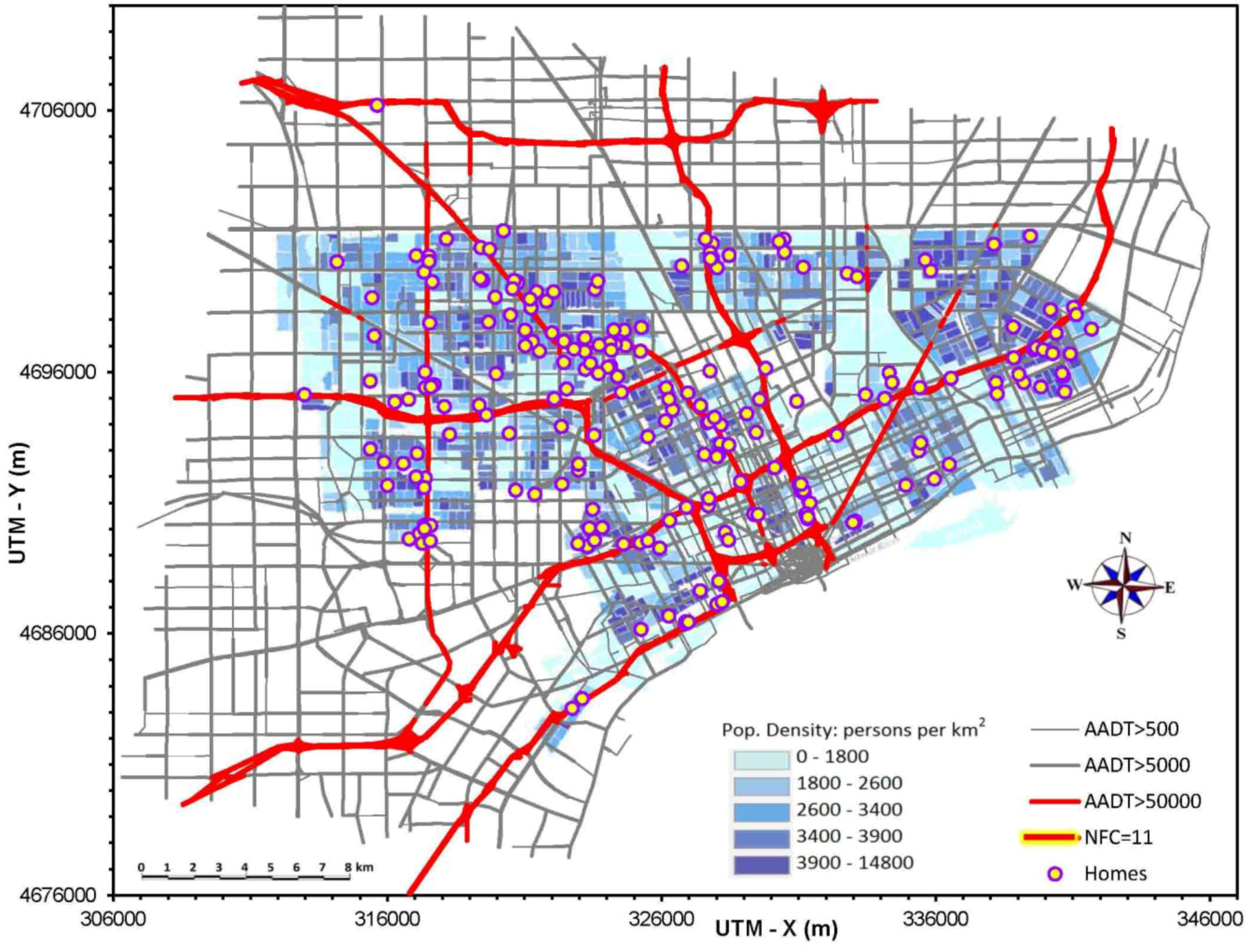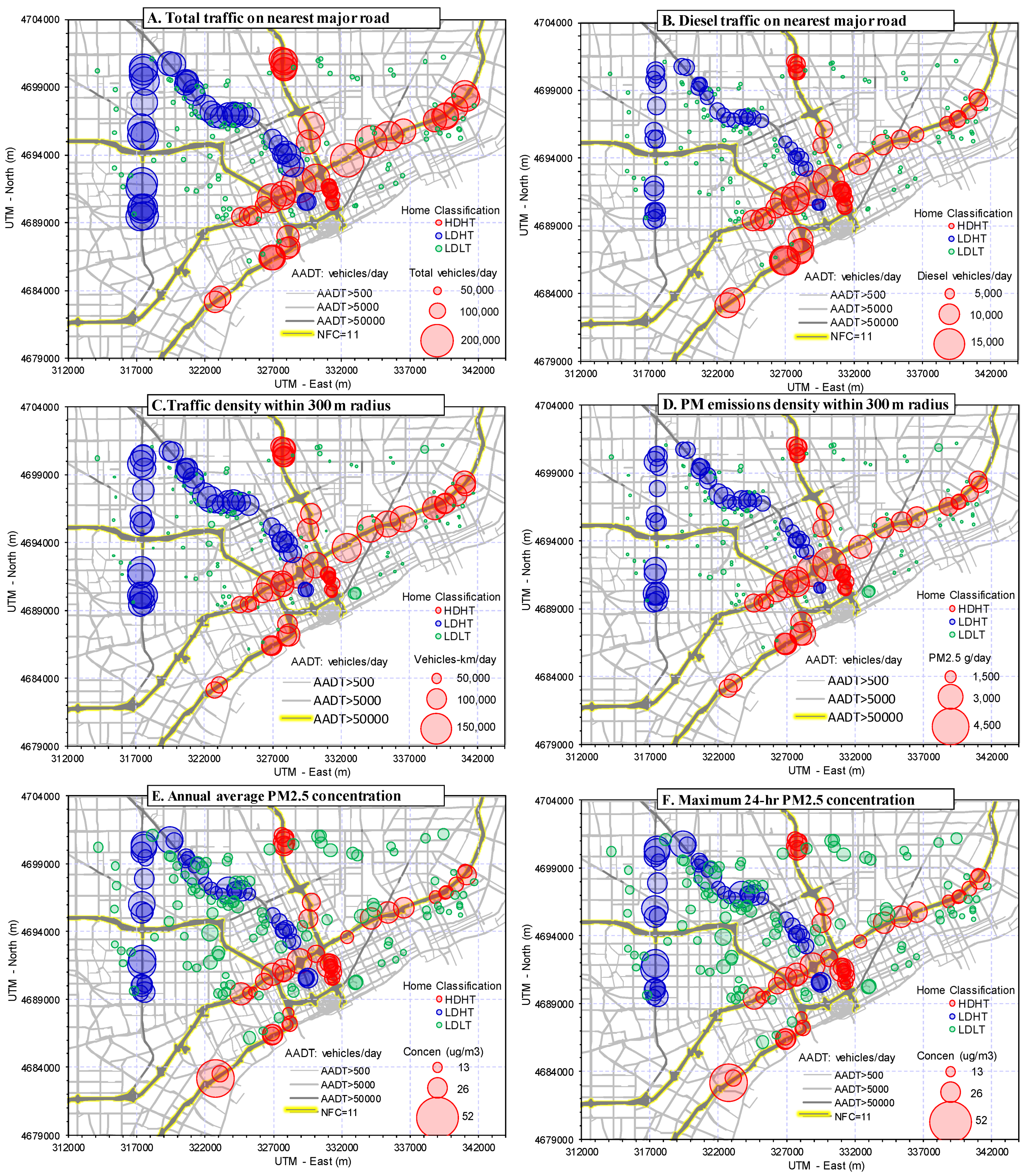 | 2. Total traffic volume on nearby roads | AADT roads within 200 m of homes, using nearest road edge and GPS home location. | Relatively simple to construct. Reasonably good volume estimates on major roads. Can select period of day, e.g., rush-hour. | Traffic volume estimates needed. Distance criterion used to determine road is arbitrary. Does not provide metric for low traffic groups. | HDHT and LDHT groups largely indistinguishable. HDHT group had considerable range. |