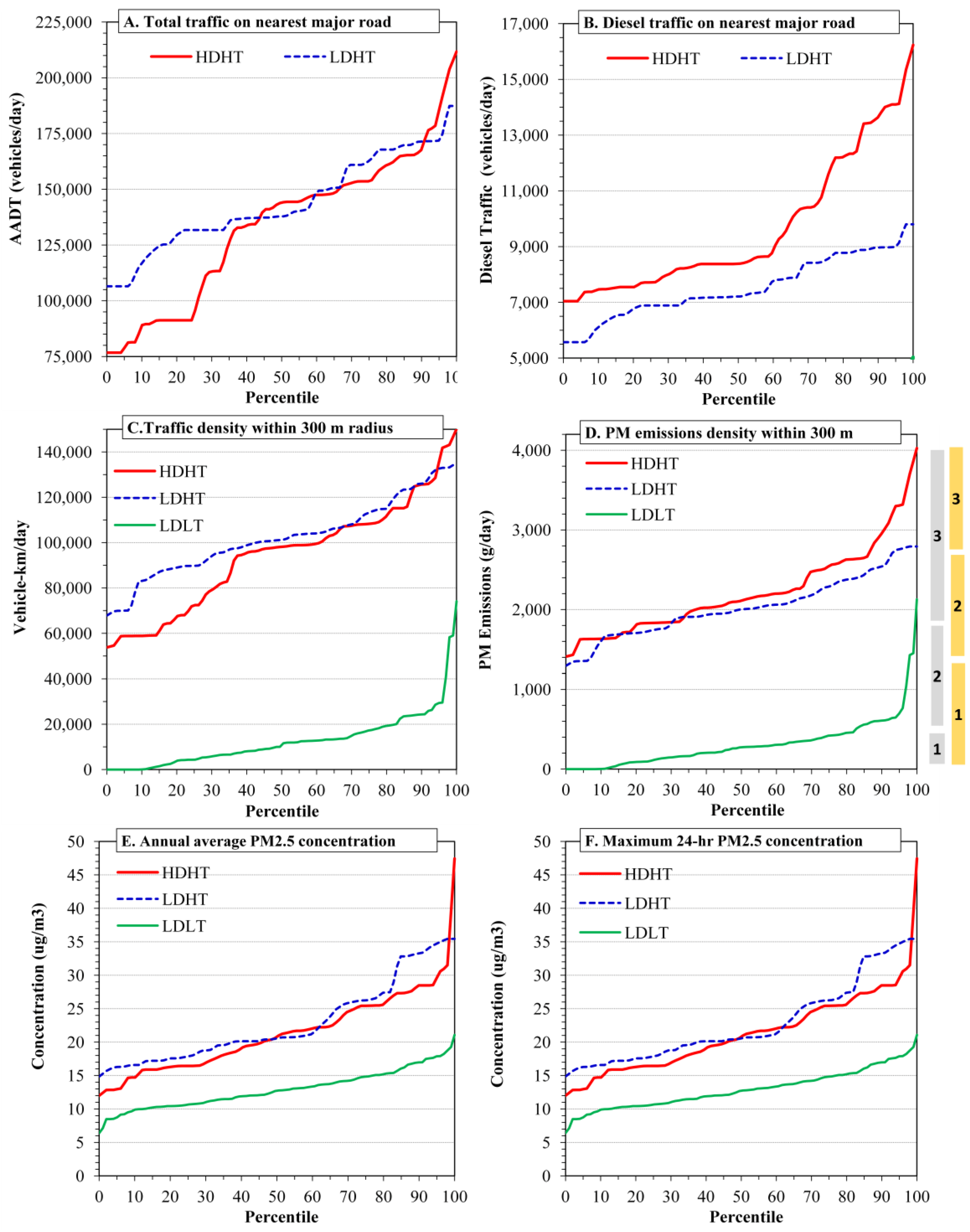 | 3. Diesel (or truck or commercial) traffic volume on nearby roads | Roads within 200 m of homes using road edge and GPS home location. | Relatively simple to construct. May relate to PM emissions from diesel traffic. Can select period of day. | Difficult to estimate diesel traffic volume accurately. Does not account for type of diesel vehicles and emissions. Otherwise as 2 above. | HDHT and LDHT groups were largely indistinguish-able. HDHT group had roughly 10%-20% higher diesel volumes than LDHT group, but about 2/3 of the values overlapped. |